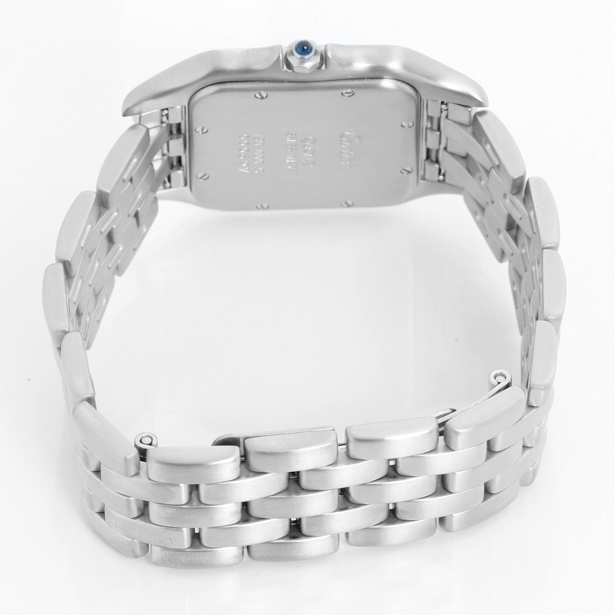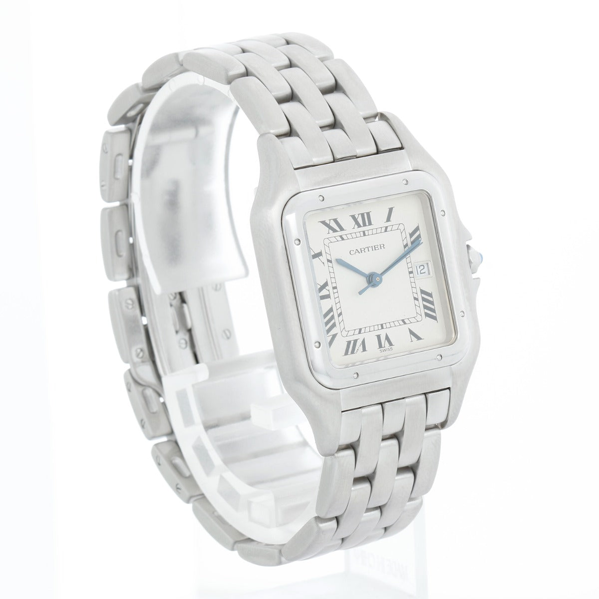 Cartier Jumbo Panther Stainless Steel Men's Quartz Watch with Date W25032P5 - Quartz. Stainless Steel (29mm x 40mm). Silver colored dial with black Roman numerals and date at 3 o'clock. Stainless Steel Panther bracelet with deployant clasp; will fit a 6 3/4 inch wrist. Pre-owned with Custom Box.