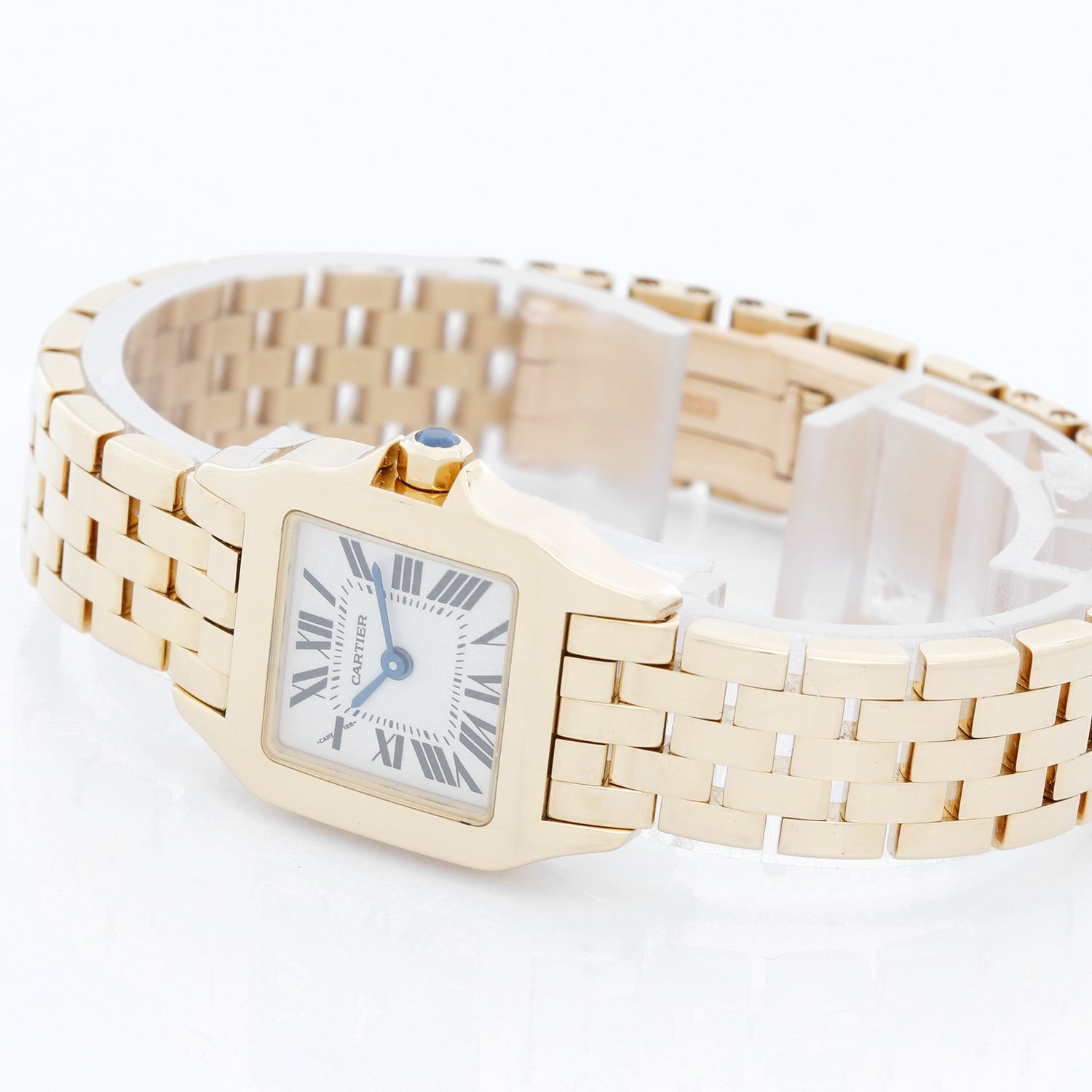 Cartier Ladies 18k Yellow Gold Santos Demoiselle Watch W25063X9 - Quartz. 18k yellow gold case (20mm x 28mm). Ivory colored dial with black Roman numerals. 18k yellow gold Cartier bracelet with deployant clasp (will fit apx. 6-1/2 in. wrist). Pre-owned with Cartier box