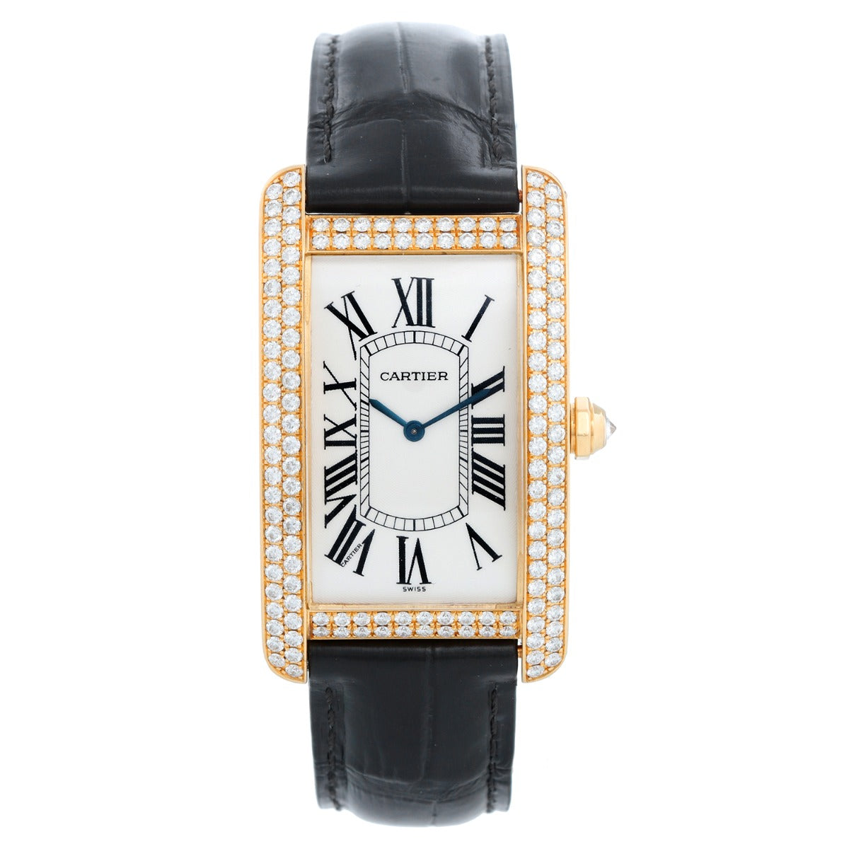 Cartier Tank Americaine Large 18k Yellow Gold & Diamond Watch Ref 1735 - Manual. 18k yellow gold case with 2-row factory diamond bezel (26mm x 45mm). Silver guilloche with black Roman numerals. Black Cartier leather strap with Cartier tang buckle . Pre-owned with Cartier box and books