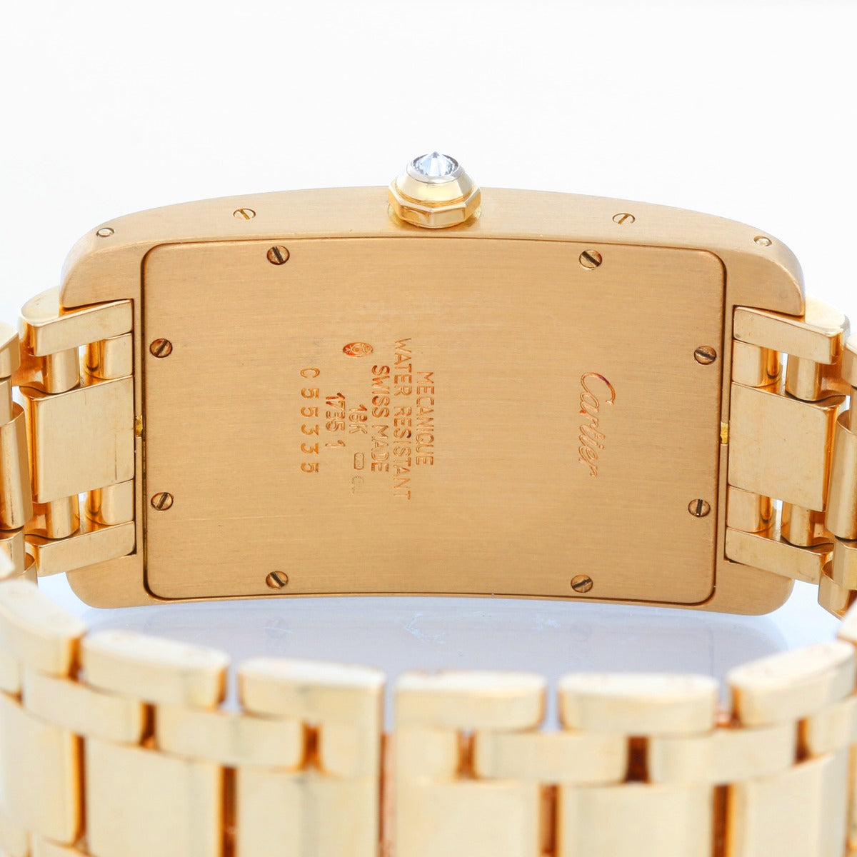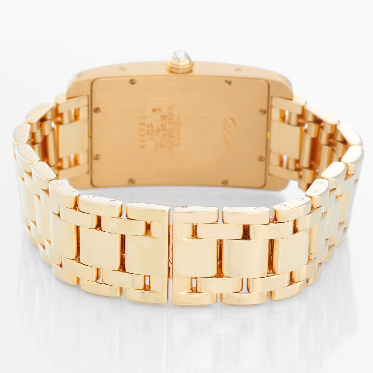 Cartier Tank Americaine Large 18k Yellow Gold & Diamond Watch Ref 1735 - Manual. 18k yellow gold case with 2-row factory diamond bezel (26mm x 45mm). Silver guilloche with black Roman numerals. 18K Yellow gold Cartier bracelet; will fit a 7 1/4 inch wrist . Pre-owned with Cartier box and books