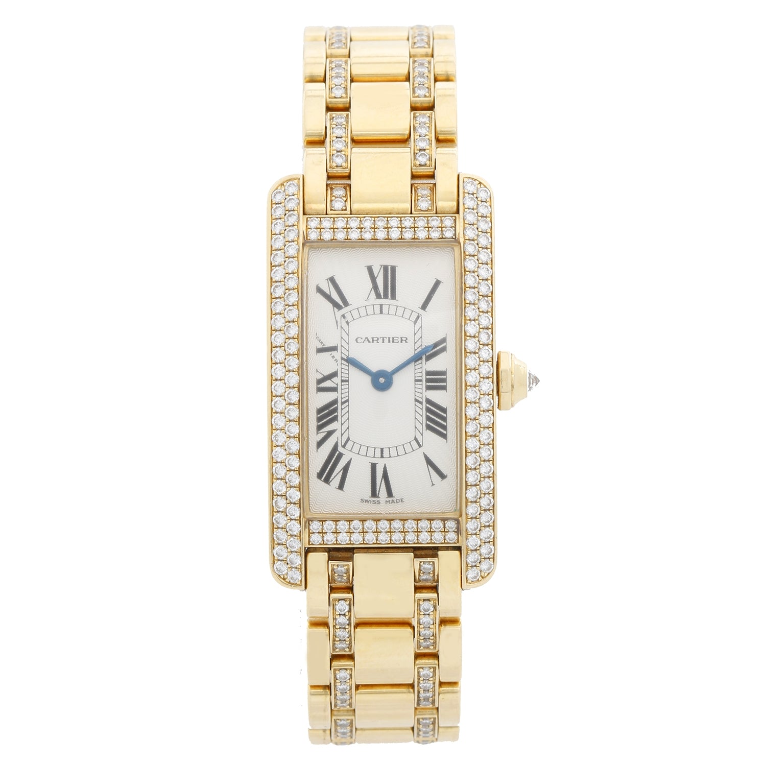 Cartier Ladies Diamond Tank Americaine 18k Yellow Gold Watch WB707231 - Quartz. 18k yellow gold case with full double row diamond bezel (19mm x 35mm). Ivory colored dial with black Roman numerals. 18k yellow gold Cartier bracelet with diamonds. Pre-owned it box and books.