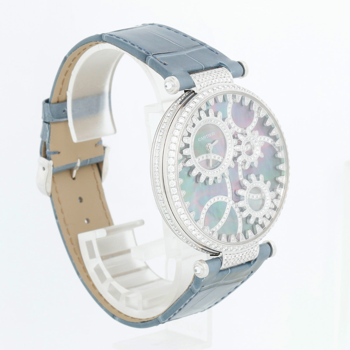 Cartier Libre Temps Moderne de Cartier Unisex Watch 3416 - Quartz . 18K white gold case (42.5mm) with diamond bezel and lugs; Total 508 brilliant cut diamonds, approximately 3.7 carats. Diamond and Tahitian Mother of pearl dial with rotating gears. Brand New Cartier Leather strap with white gold Cartier buckle with diamonds. Pre-owned with Cartier box and books