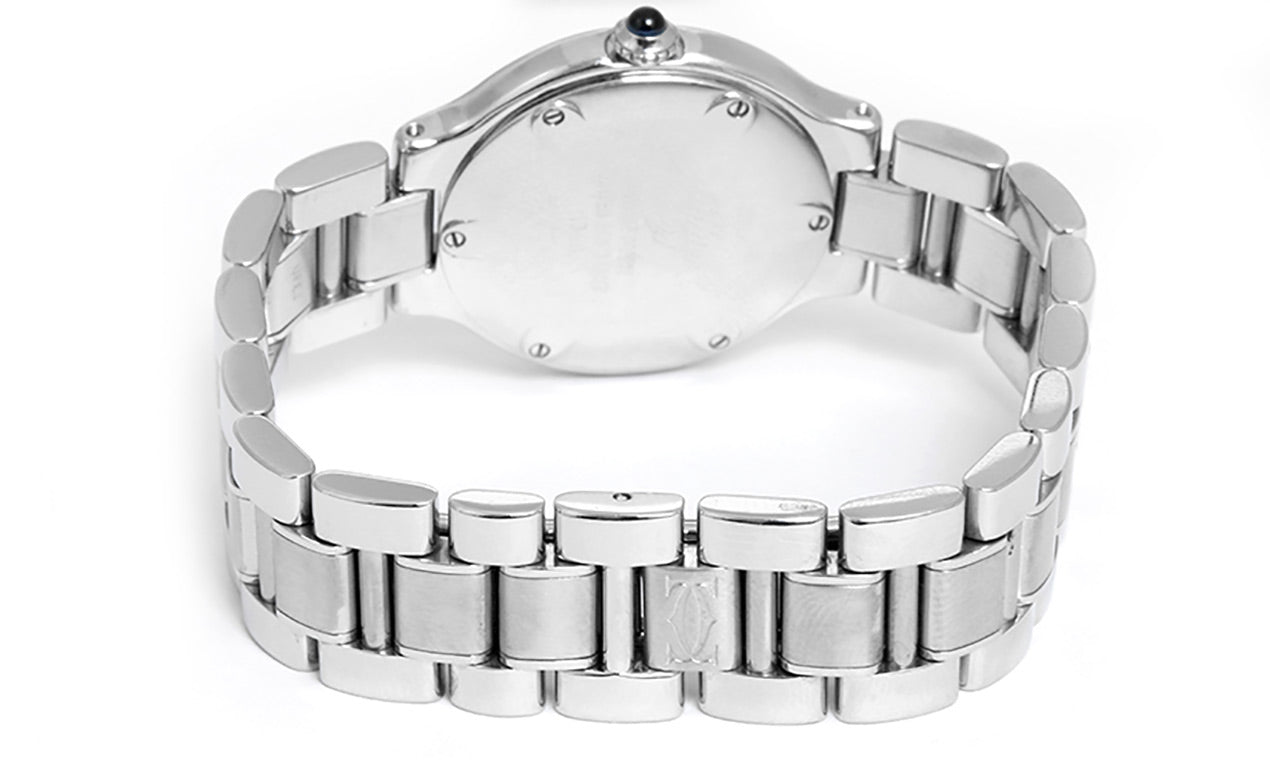 Cartier Must 21 Ladies Stainless Steel Watch W10109T2 - Quartz. Stainless steel case; bezel engraved with Roman numerals (28mm diameter). Silver dial. Stainless steel Cartier bracelet. Pre-owned with custom box.