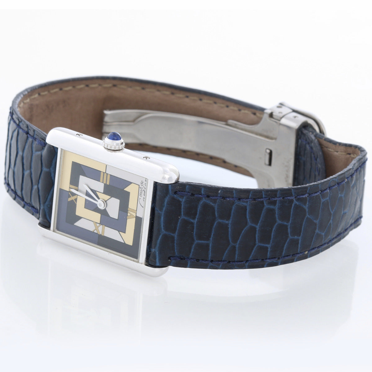 Cartier Must de Cartier Sterling Silver Art Deco Watch 1616 - Quartz. Sterling Silver (23mm X 30 mm) . Multicolored dial forming an Art Deco design . Leather strap with Stainless steel deployant clasp . Pre-owned with Cartier box and books..