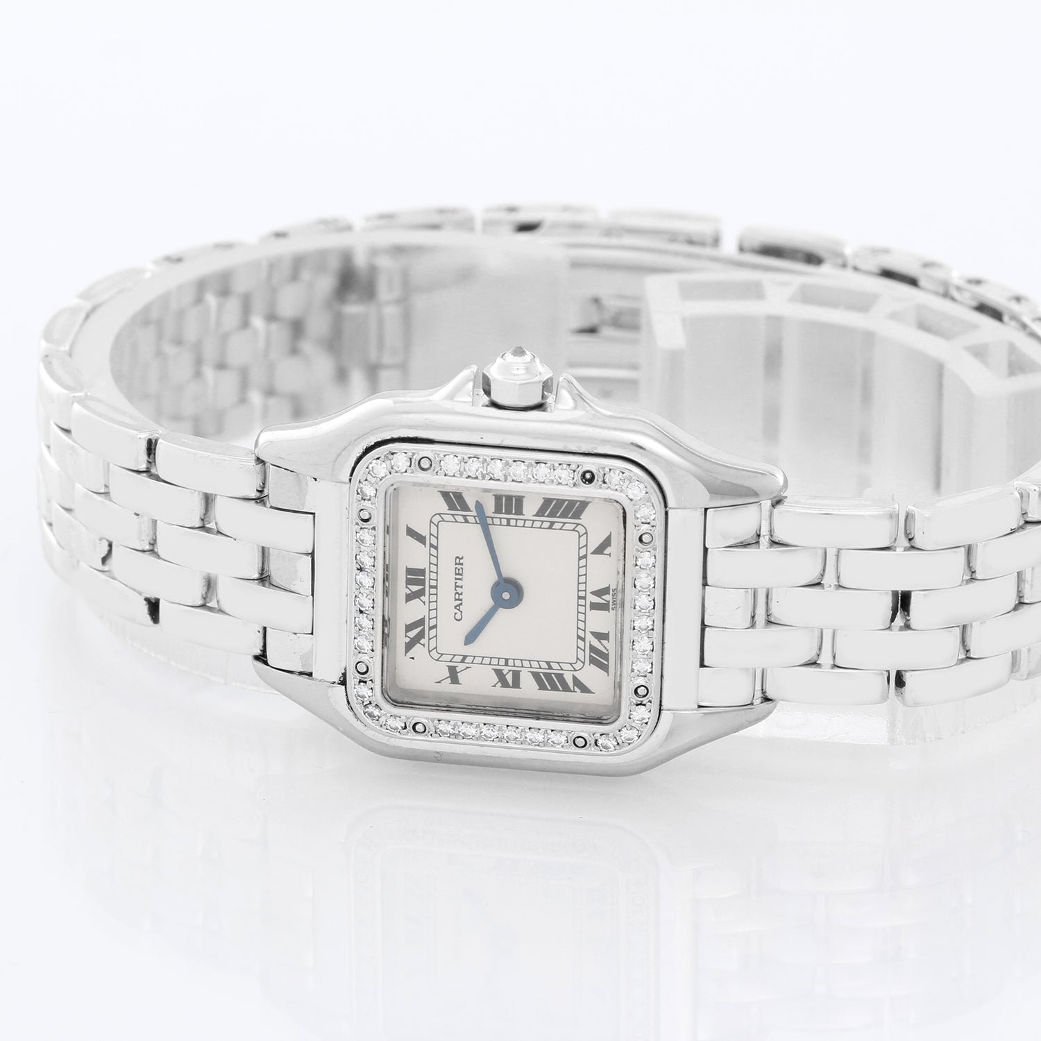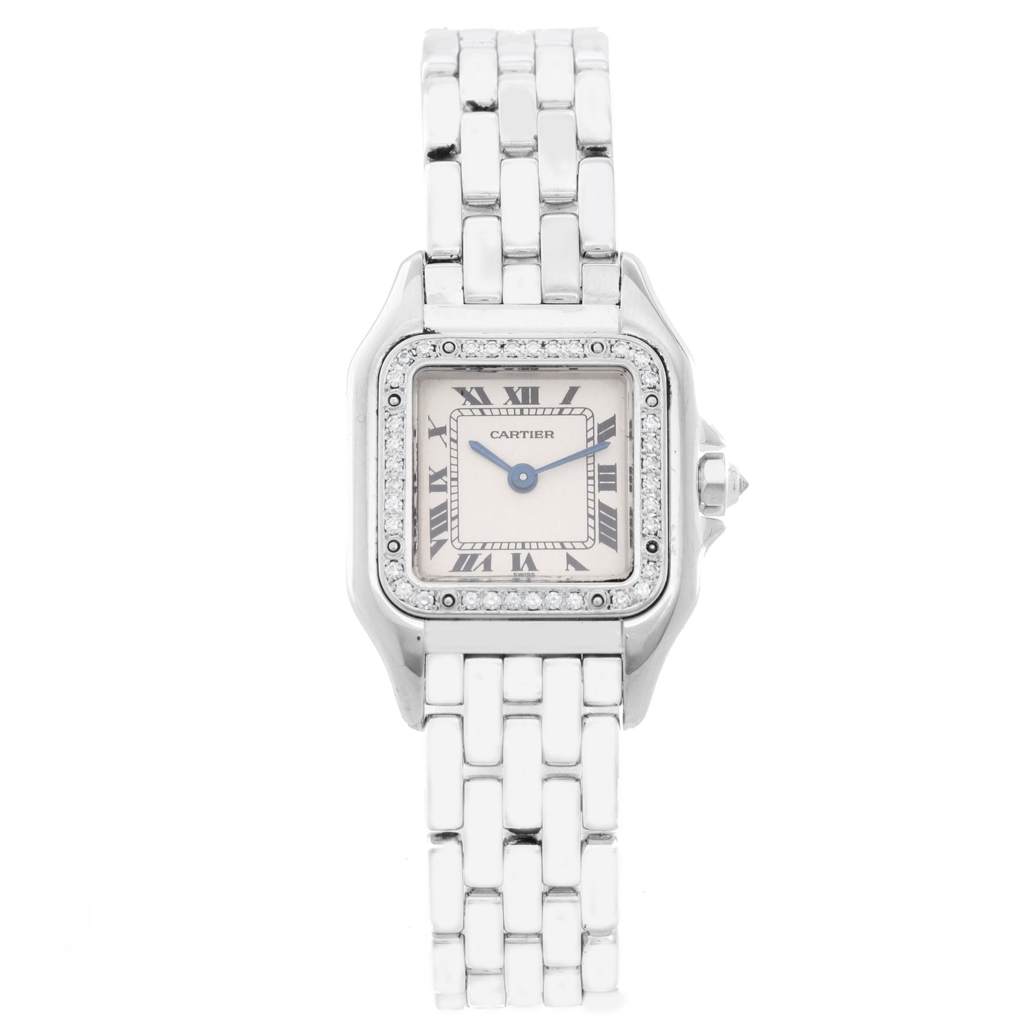Cartier Panther 18K White Gold with Diamond Bezel WF3091F3 - Quartz. 18K White Gold ( 22 mm x 22 mm ) with diamond bezel. Ivory dial with blue hands; Roman numerals. 18K White Gold bracelet. Pre-owned with Cartier box and papers.