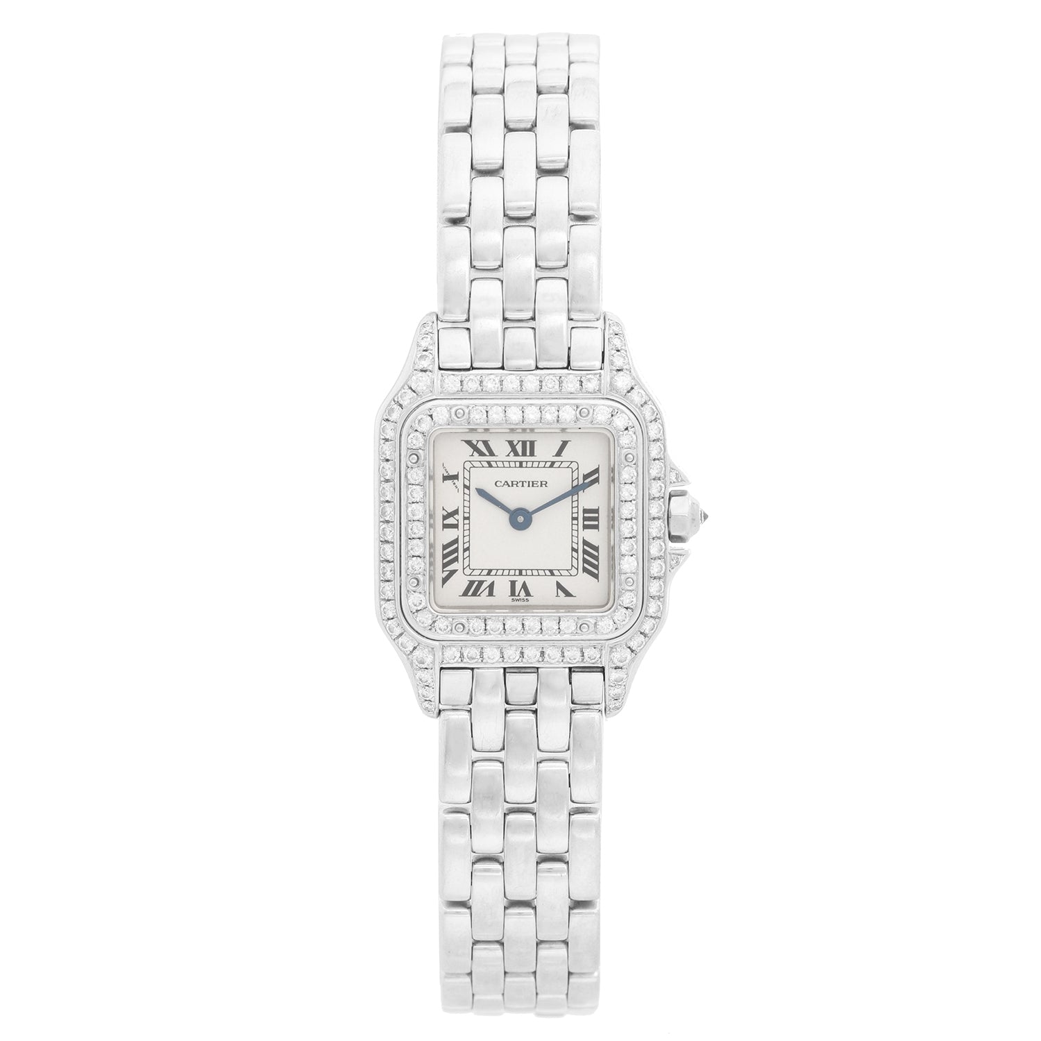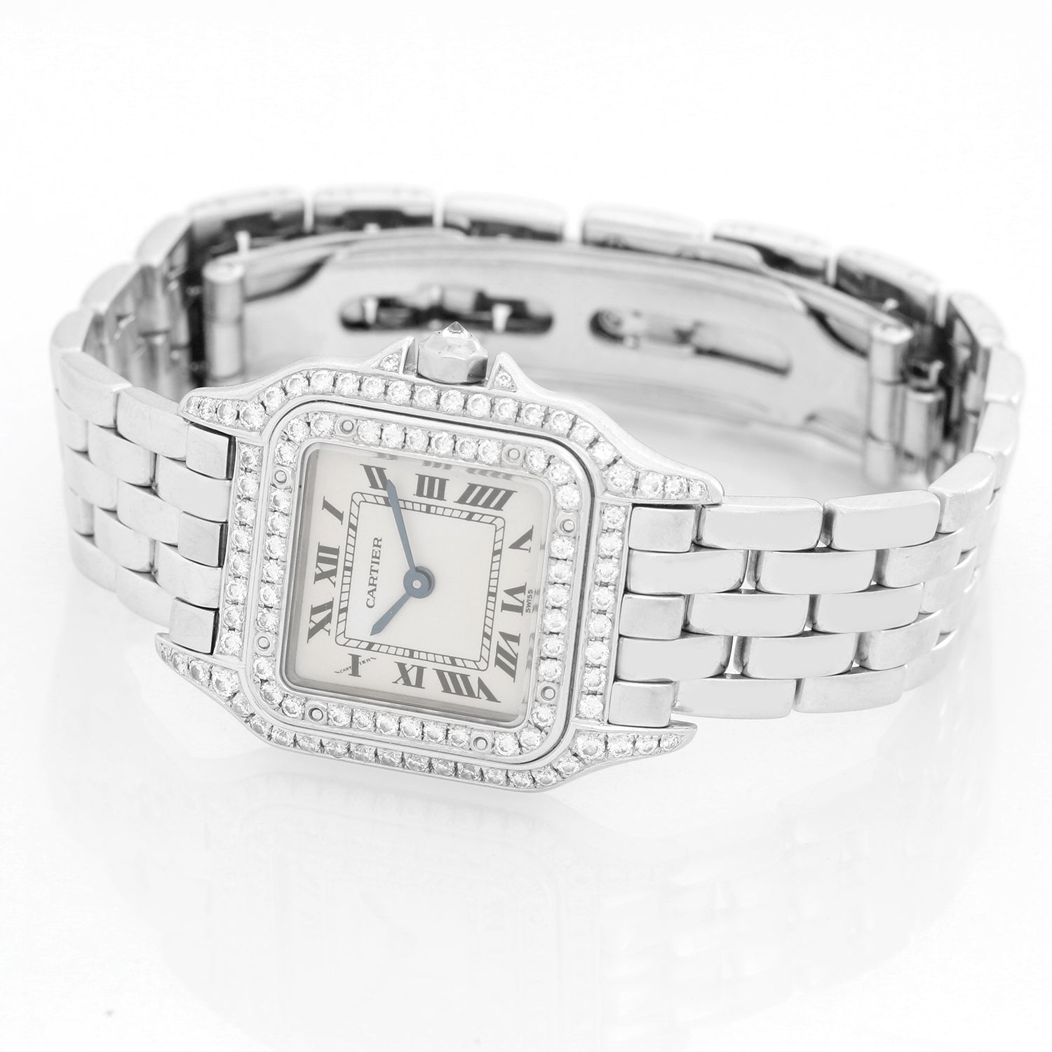 Cartier Panther 18K White Gold with Double Diamond Bezel - Quartz. 18K White Gold case ( 22 mm ). Ivory dial with blue steel hands; Roman numerals. 18K White Gold bracelet. Pre-owned with Cartier box and books.