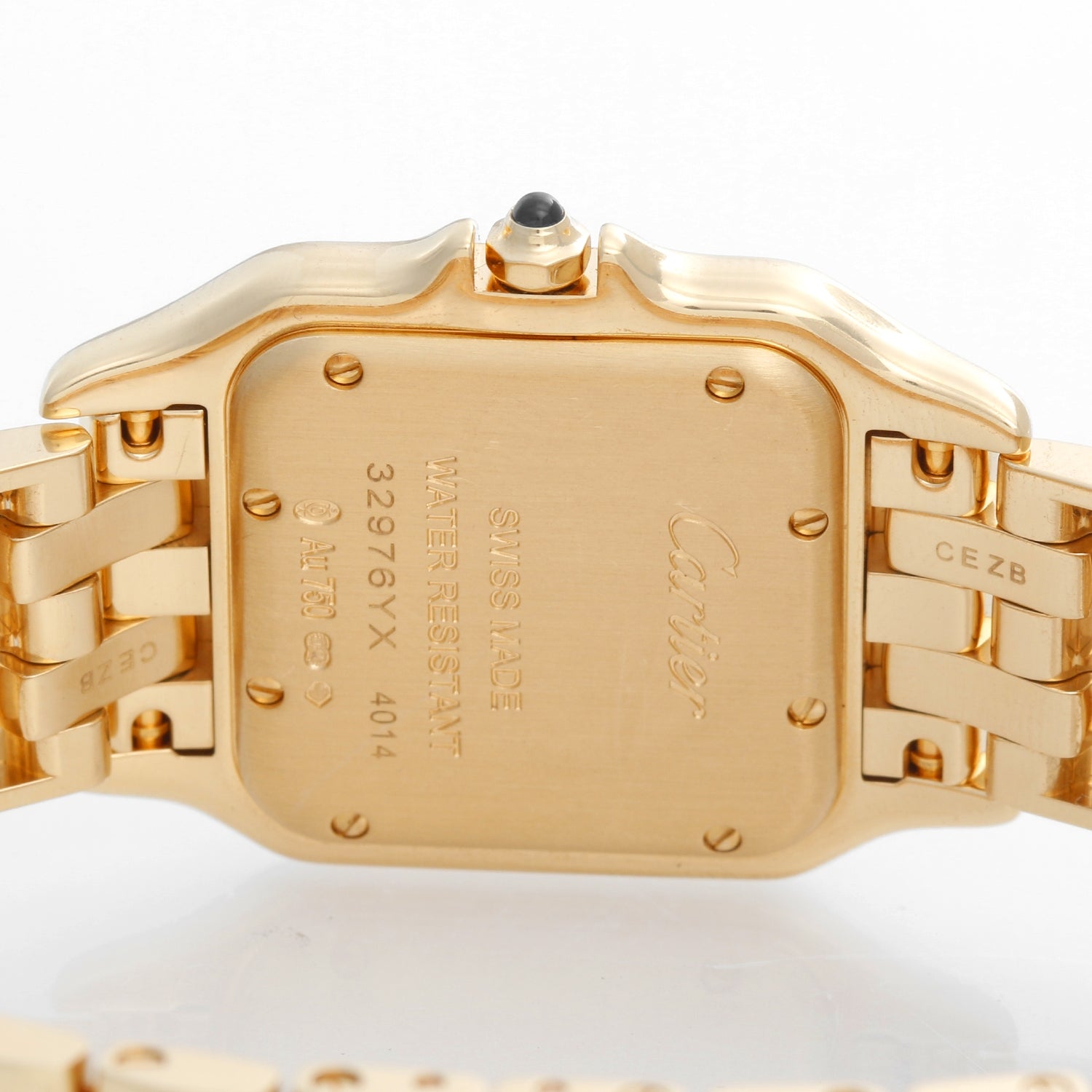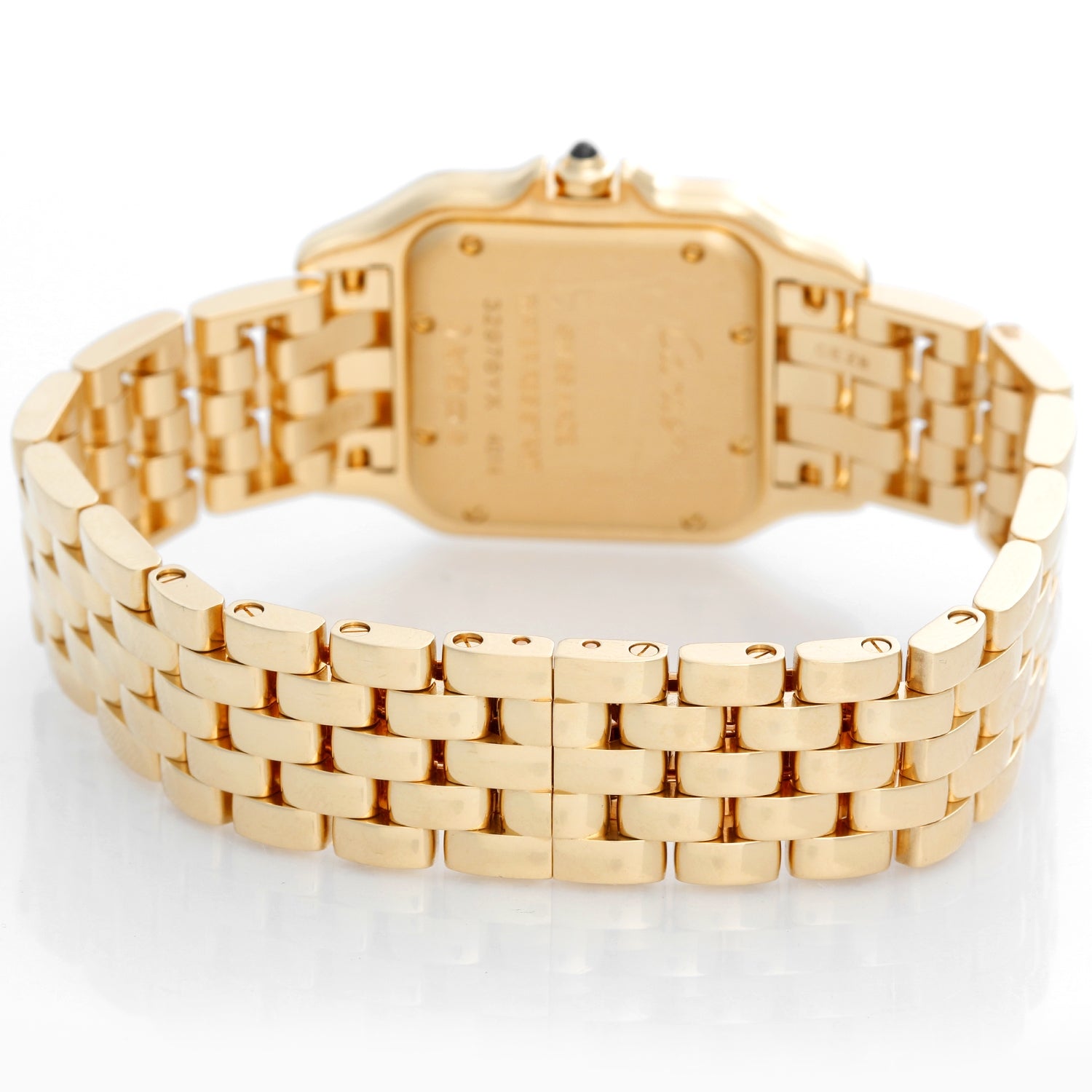 Cartier Panther 18k Yellow Gold Midsize Watch WGPN0009 - Quartz movement. 18k yellow gold case (27 x 37 mm). Silver dial with black Roman numerals. 18k yellow gold Cartier bracelet with deployant clasp. Pre-owned with Cartier box. Current model on Cartier website.