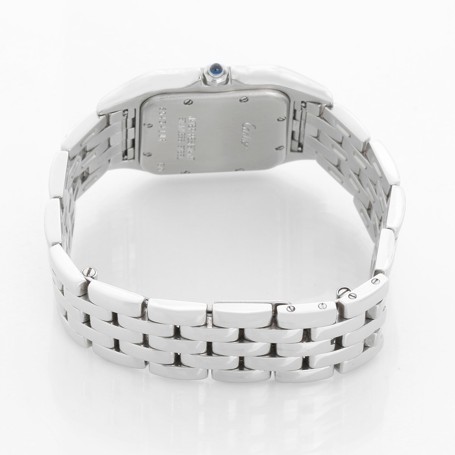 Cartier Panther Stainless Steel Midsize Men's 27mm Watch - Quartz. Stainless steel case (27mm x 37mm). Ivory colored dial with black Roman numerals and date at 5 o'clock. Stainless steel Cartier Panther bracelet. Pre-owned with DeMesy box.