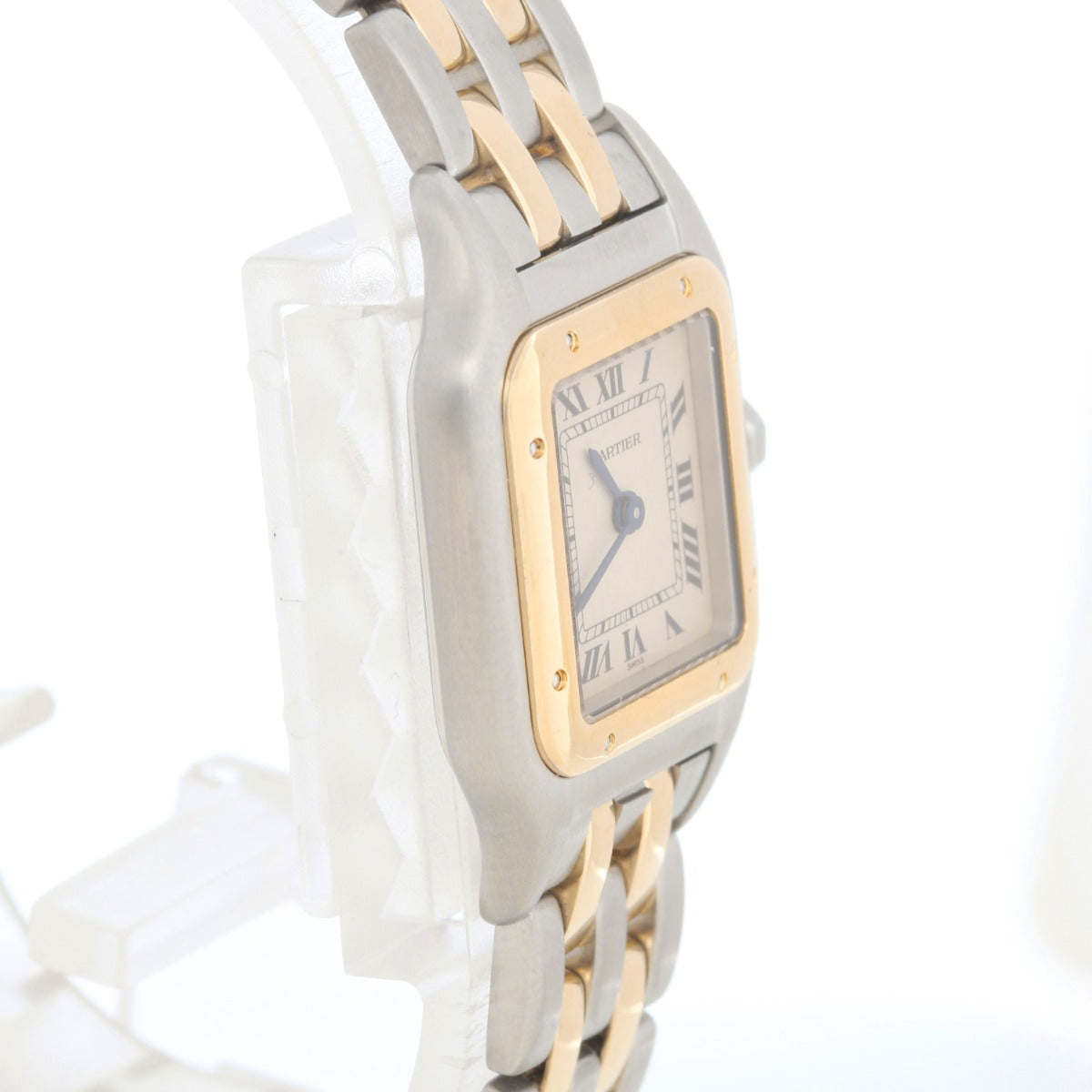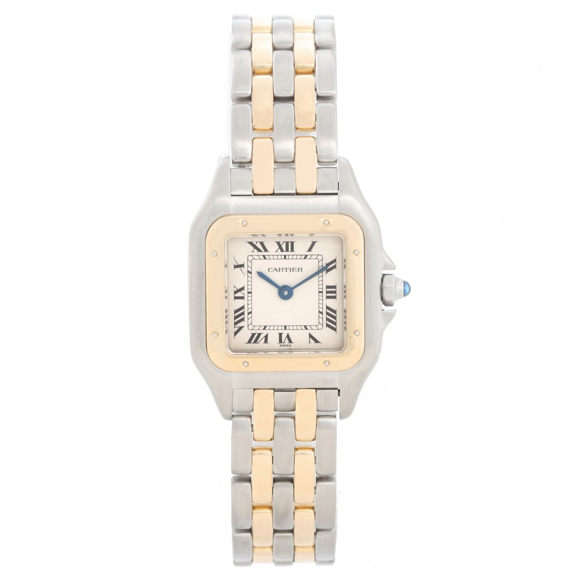 Cartier Panthere Ladies 2-Tone 2-Row Steel & Gold Watch W25029B6 - Quartz. Stainless steel case with 18k yellow gold bezel (21mm x 30mm). Ivory colored dial with black Roman numerals. Stainless steel and 2-row 18k yellow gold Panthere bracelet. Pre-owned with custom box.