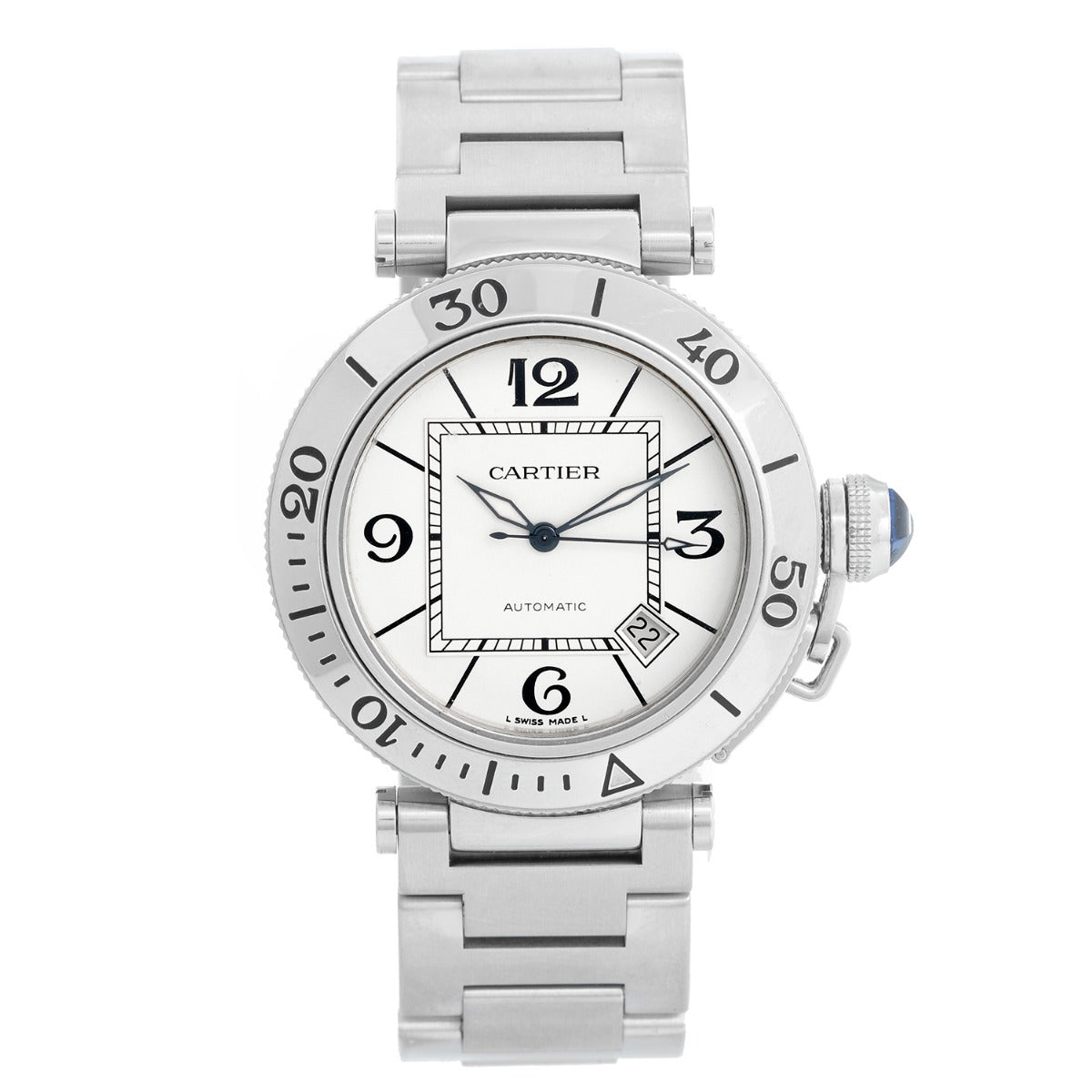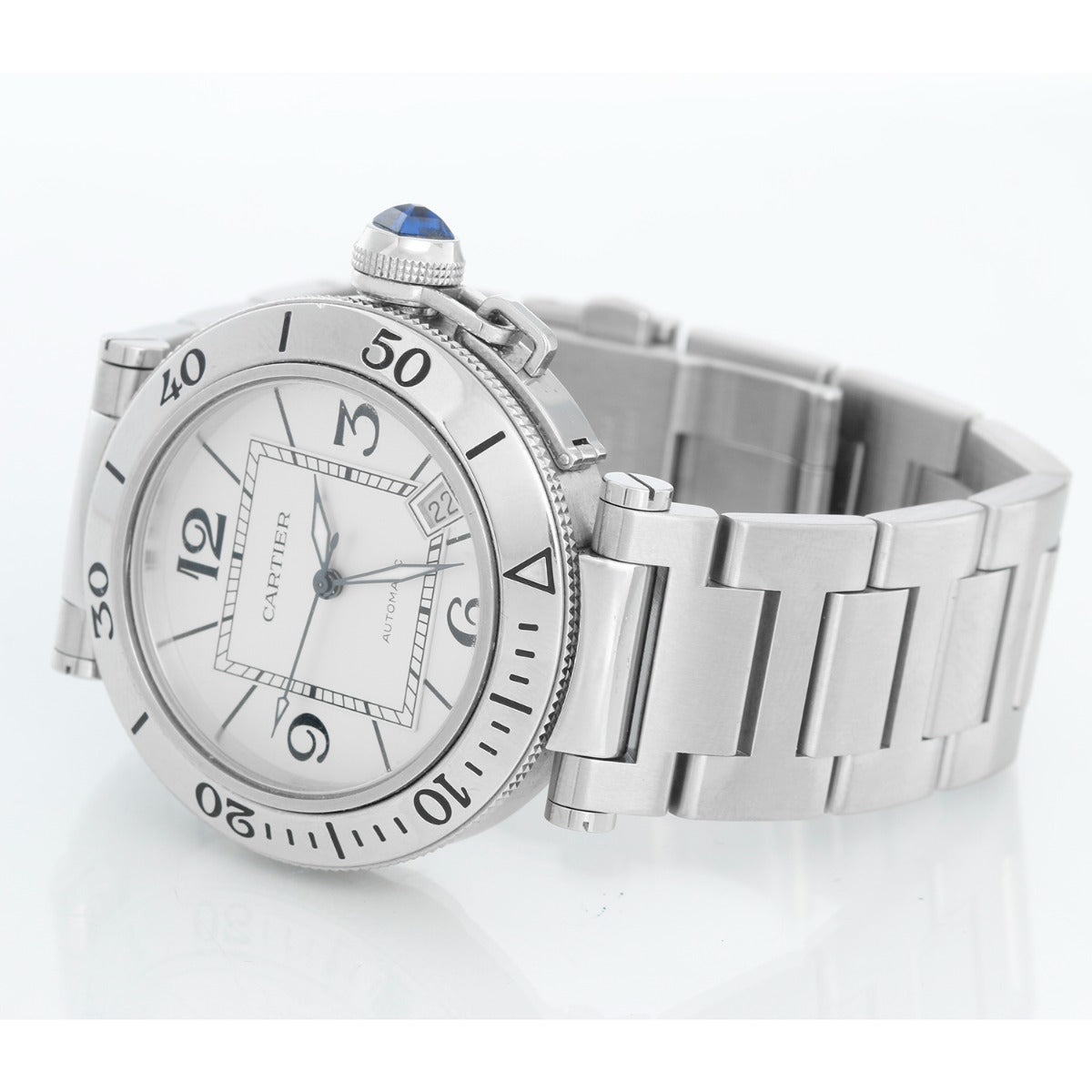 Cartier Pasha Seatimer Stainless Steel Mens Watch 2790 - Automatic Winding. Stainless Steel round style case with rotating bezel (40mm ). Silvered Dial with black hour markers & Arabic numerals; Date at 4 o'clock. Stainless Steel Cartier Pasha bracelet with deployant clasp; will fit a 7 1/2 inch wrist . Pre-owned with custom box.
