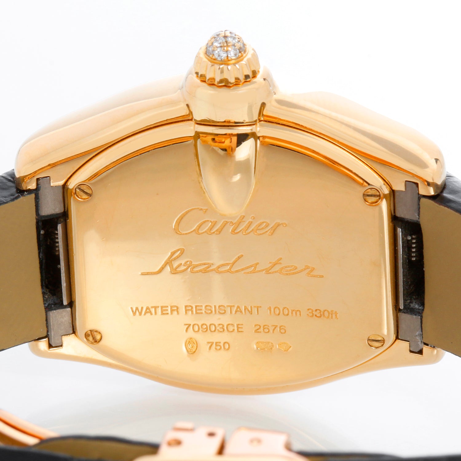 Cartier Roadster 18k Yellow Gold Quartz WE500160 2676 - Quartz. 18k yellow gold tonneau style case with diamond case (31mm x 37mm). Silver guilloche dial with black Roman numerals; date at 3 o'clock. Black Cartier leather strap with 18K yellow gold deployant clasp. Pre-owned with Cartier box.
