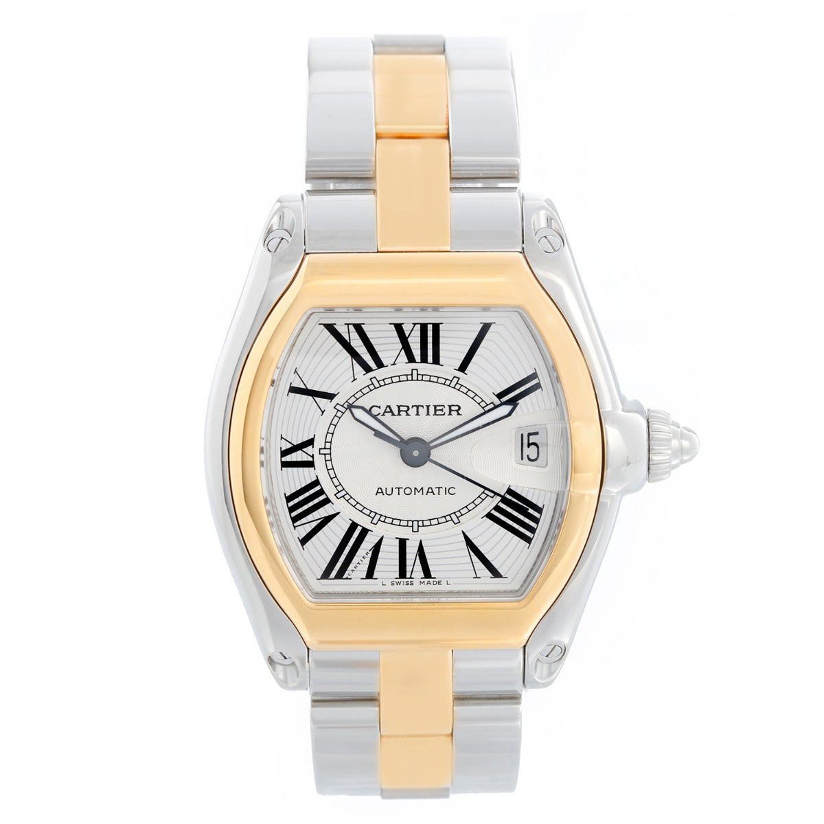 Cartier Roadster Men's Steel & Gold 2-Tone Watch W62031Y4 - Automatic winding. Stainless steel case with 18k yellow gold bezel. Silver dial with black Roman numerals; date at 3 o'clock. Stainless steel and 18k yellow gold Cartier Roadster bracelet with deployant clasp. Pre-owned with custom box.