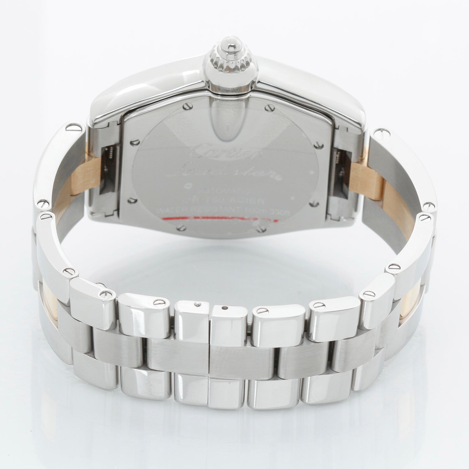 Cartier Roadster Men's Steel & Gold 2-Tone Watch W62031Y4 2510 - Automatic winding. Roadster. Stainless steel case with 18k yellow gold bezel ( 37mm). Silver dial with black Roman numerals; date at 3 o'clock. Stainless steel and 18k yellow gold Cartier Roadster bracelet with deployant clasp. Pre-owned with custom box.