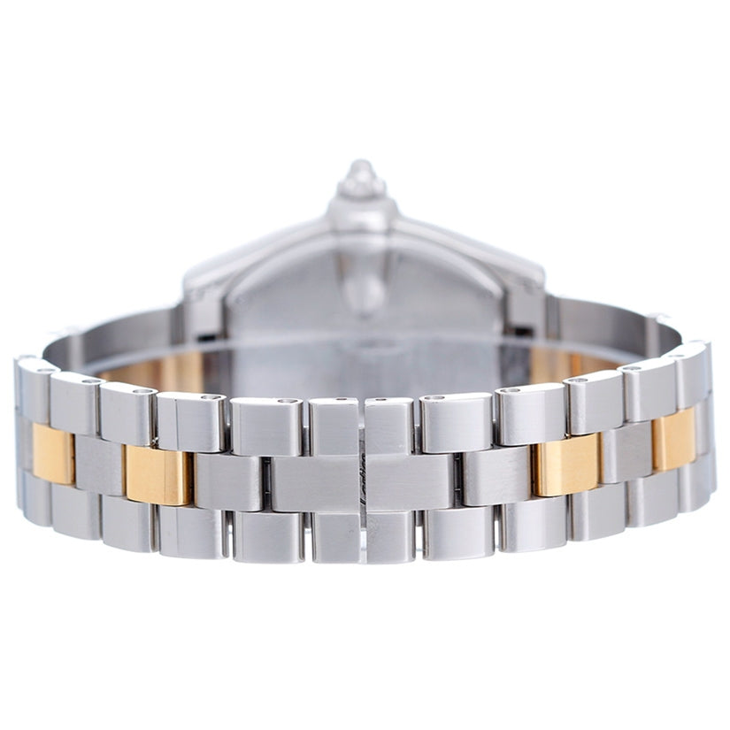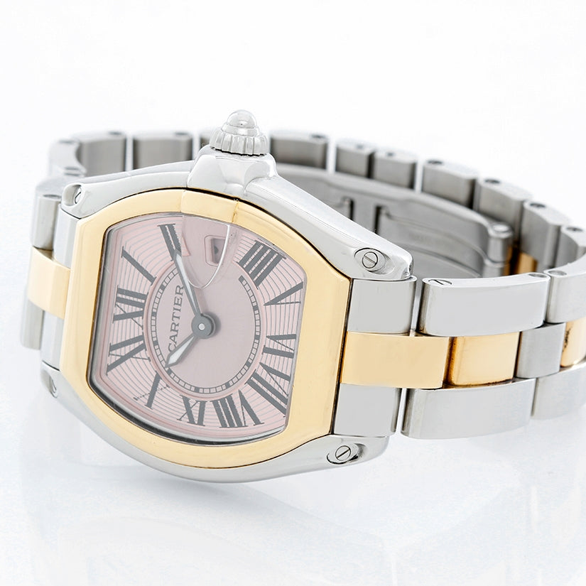 Cartier Roadster Steel & Gold Ladies Small 30mm Quartz Watch W62026Y4 - Quartz. 2-tone stainless steel and 18k yellow gold case (30mm x 36mm). Pink dial with black Roman numerals; date at 3 o'clock. Stainless steel and 18k yellow gold Cartier bracelet with deployant clasp. Pre-owned with Cartier box and books.