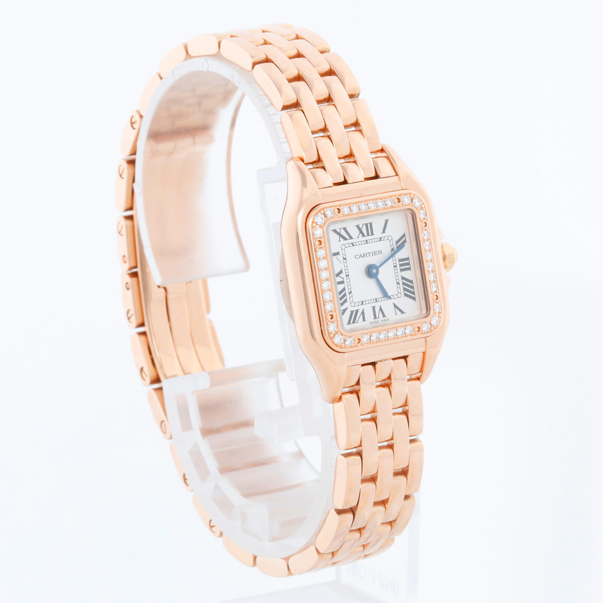 Cartier Rose Gold Small Panther With Diamonds Ladies Watch - Quartz. 18K Rose Gold with brilliant cut diamond bezel ( 22 x 30 mm ) . Silver dial with black roman numerals . 18K Rose Gold bracelet . Pre-owned with Cartier box with card. Dated 2018. This is the current Cartier model. .