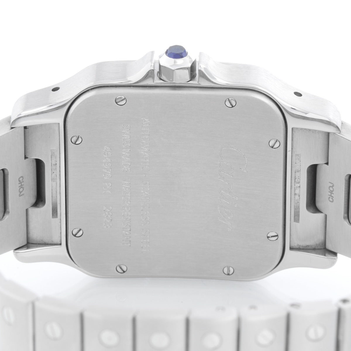 Cartier Santos Steel XL Automatic Men's Watch W20098D6 2823 - Automatic winding. Stainless steel case (34mm x 45mm). Silver dial with black Roman numerals and date at 5 o'clock. Stainless steel Cartier deployant style bracelet; fits a 7 inch wrist but can add additional links if necessary. Pre-owned with Cartier box and books.