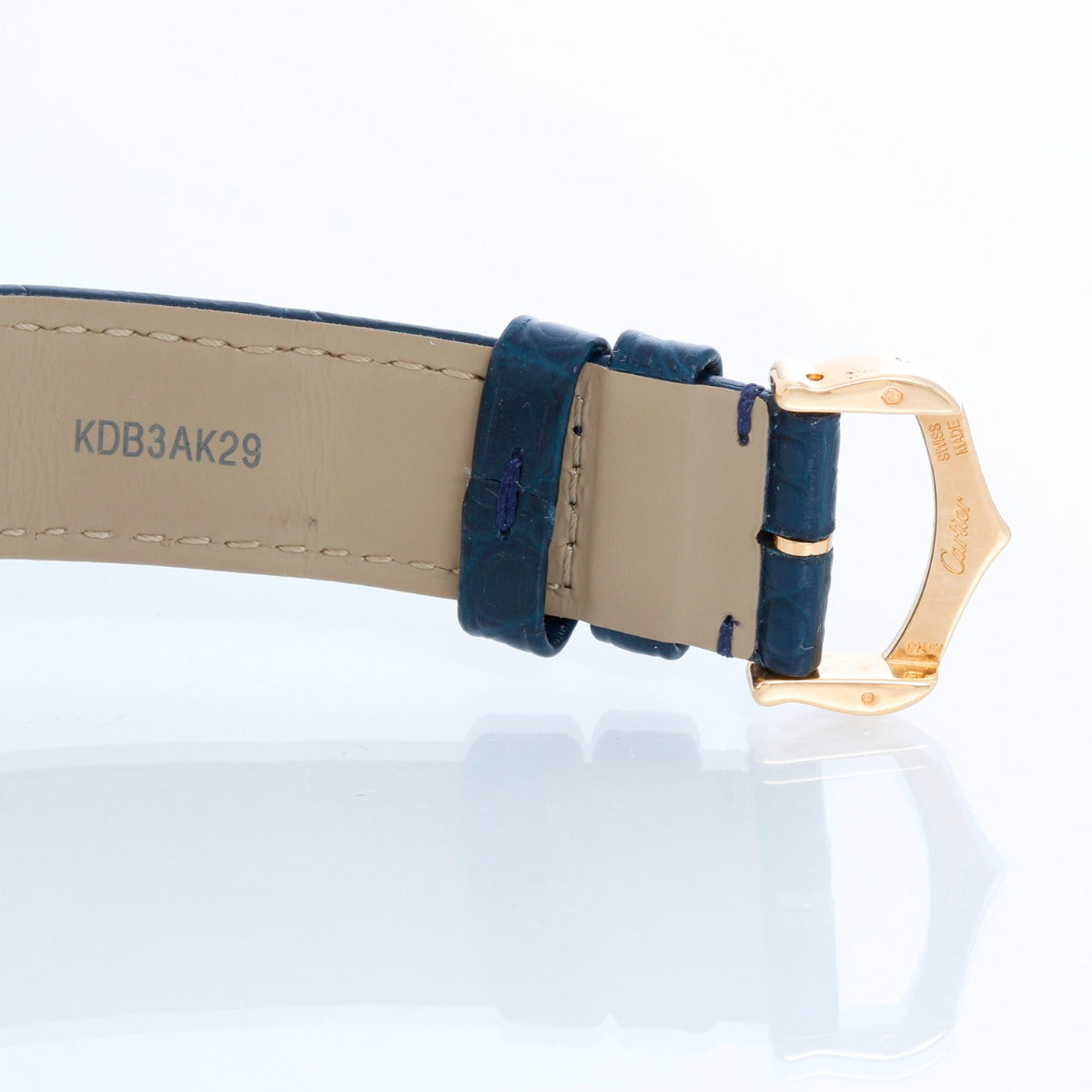 Cartier Santos Dumont 18k Yellow Gold WGSA0077 4532 - Quartz. 18k yellow gold square case (31 mm x 42 mm) . Blue Dial with Roman numerals. Blue Cartier alligator strap with 18k yellow gold tang buckle. Pre-owned with Cartier box, books and card.