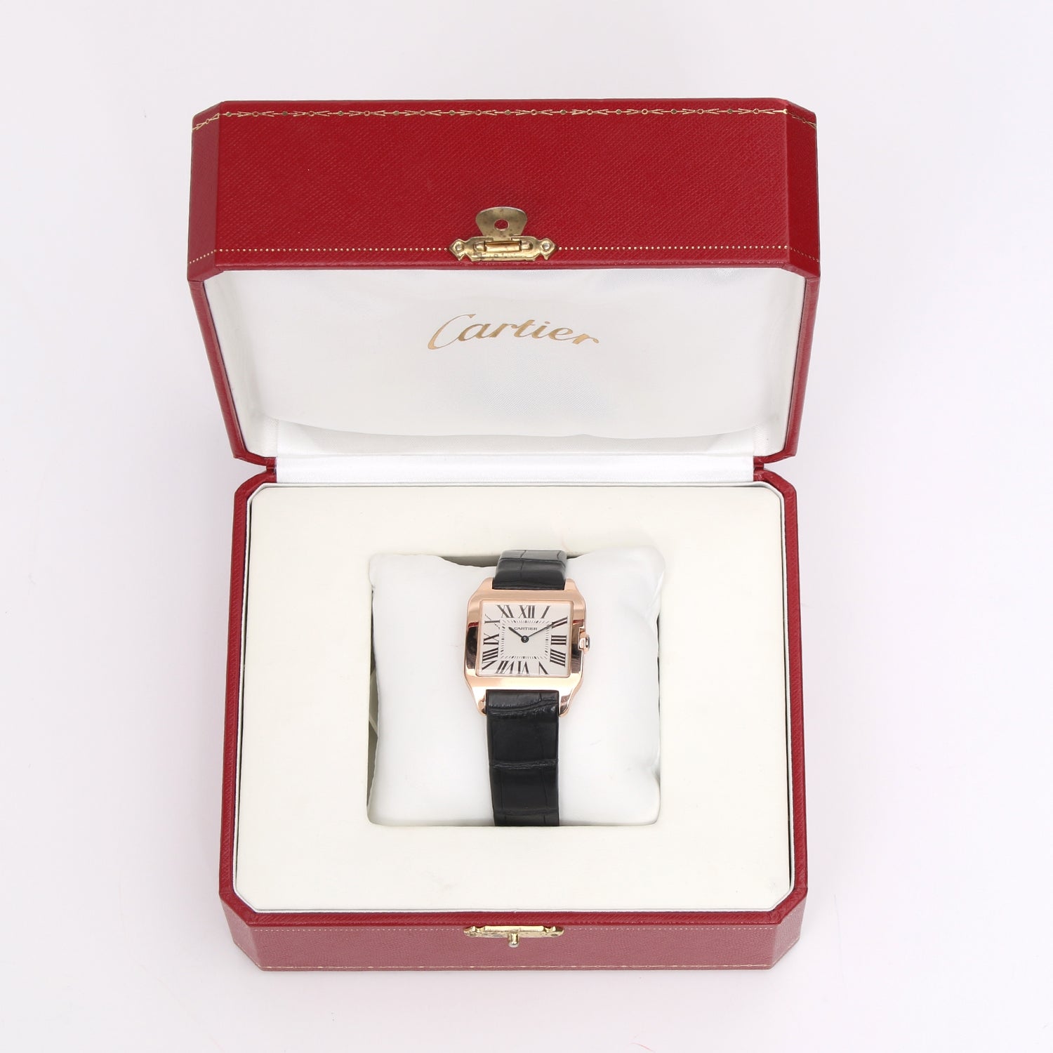 Cartier Santos Ladies Dumont Quartz, 18k Rose Gold, W2009251 - Quartz. 18k rose gold square case (30 mm x 39 mm) diameter. Silver Dial with Roman numerals. Black alligator strap with 18k rose gold deployant style buckle. Pre-owned with Cartier box.