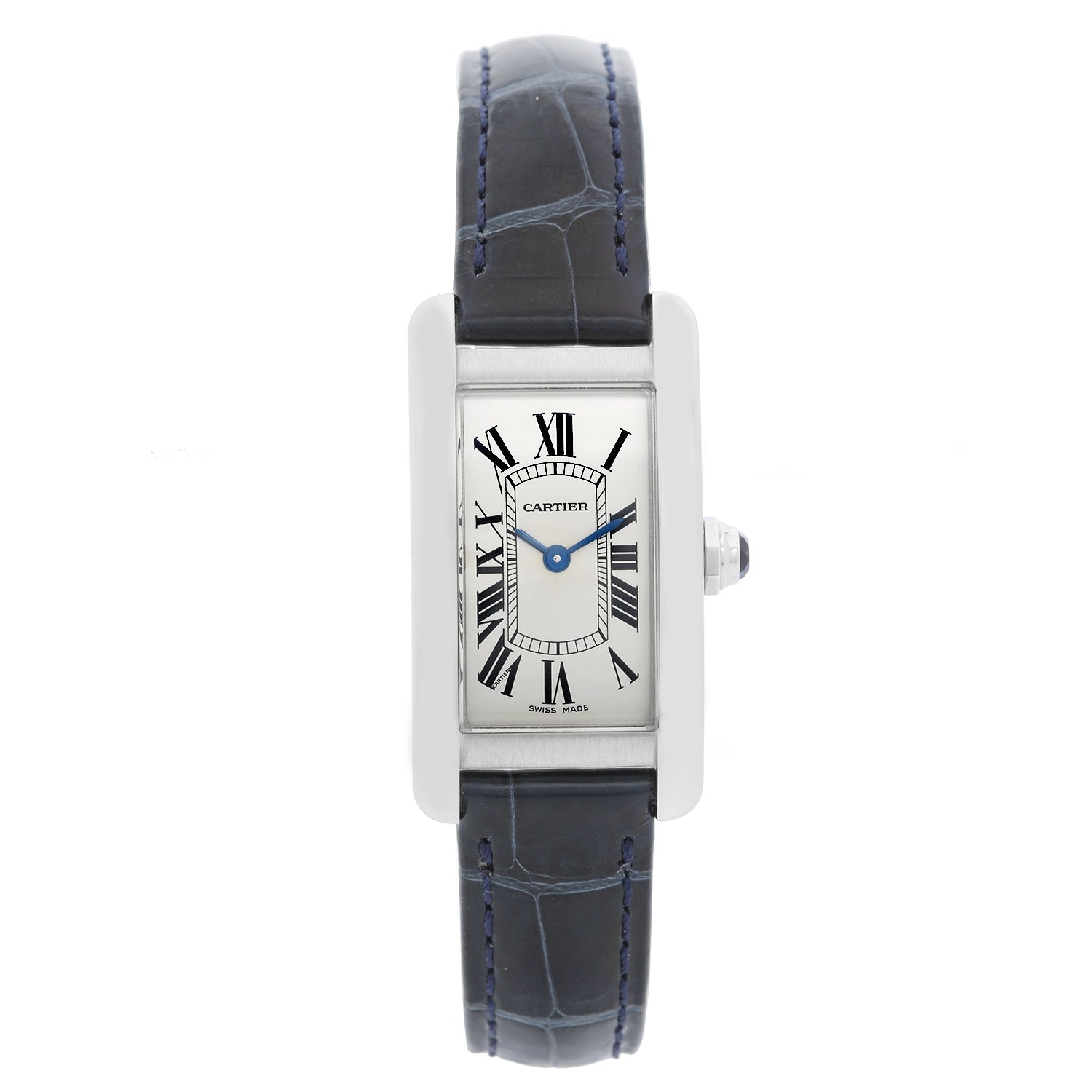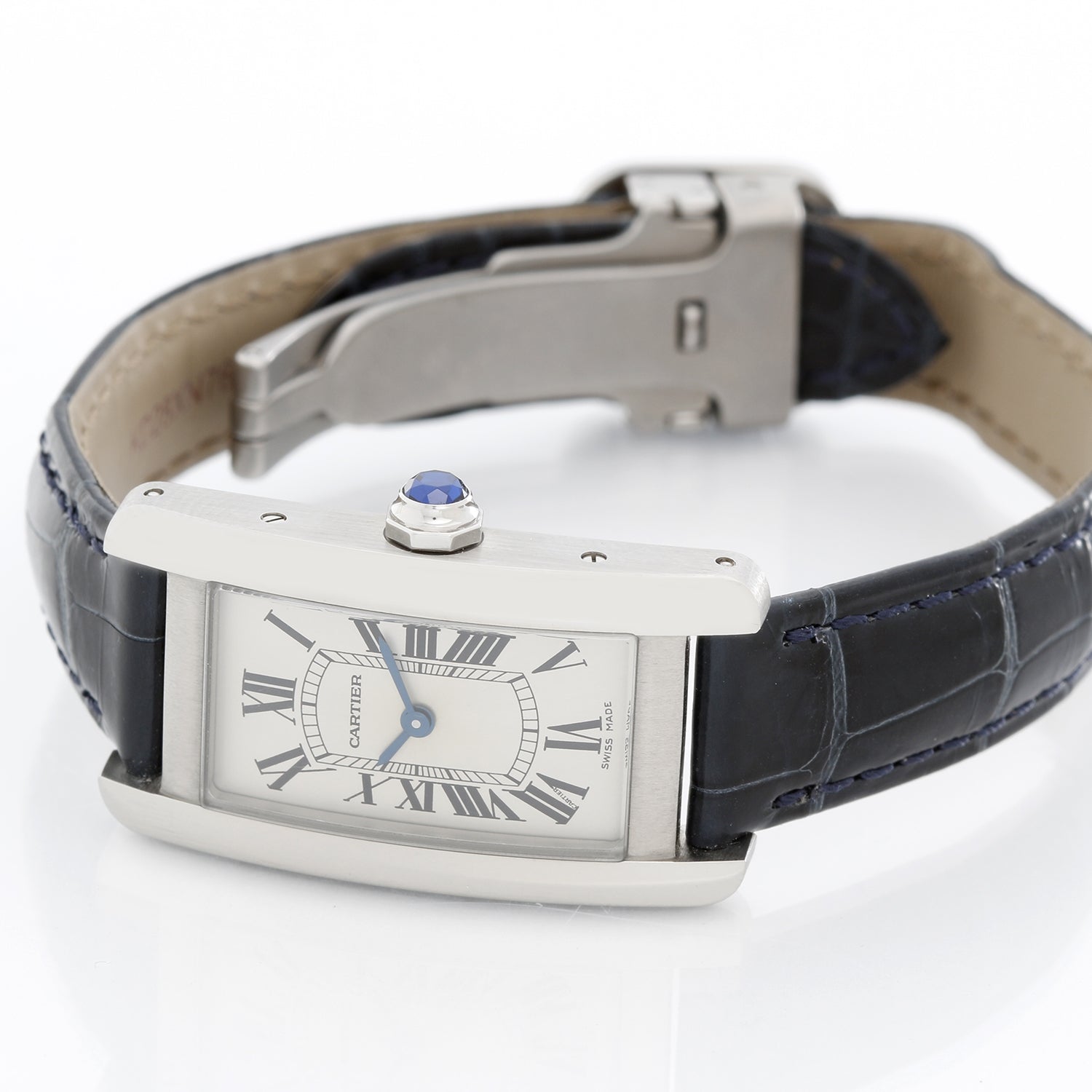 Cartier Stainless Steel Tank Americaine Watch - Quartz . Stainless Steel . Ivory dial with Roman numerals ( 19 x 35 mm ) . Blue alligator strap . Pre-owned with Cartier box and papers .