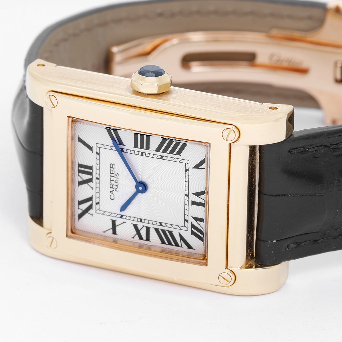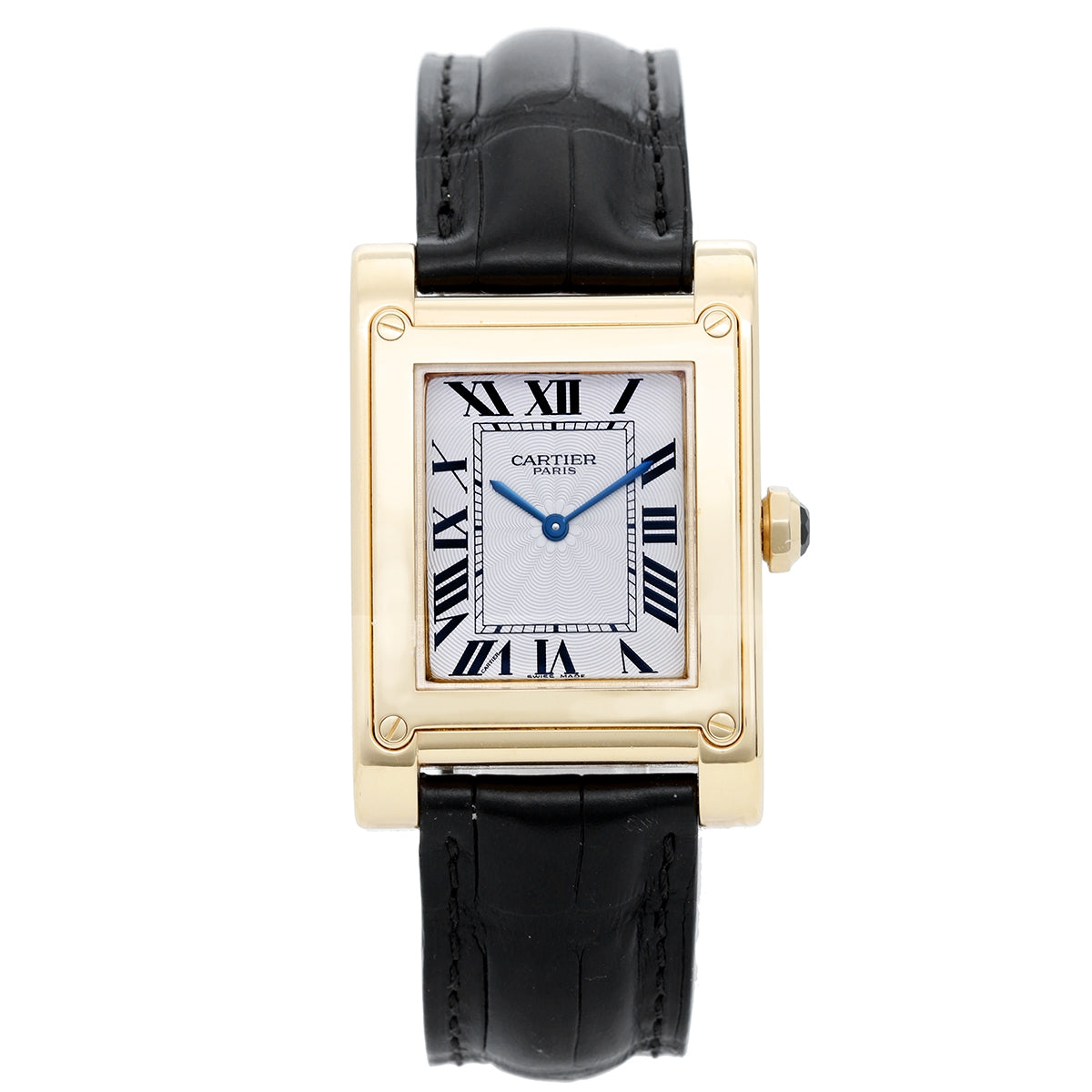 Cartier Tank A Vis Ref 2608 F Watch - Manual. 18K Yellow Gold ( 18 mm x 40.5 mm ). White dial with Roman Numerals. Cartier black strap with 18K gold Cartier deployant clasp. Pre-owned with box and papers. Service papers, original invoice too. Full Cartier service 4 /22/17.