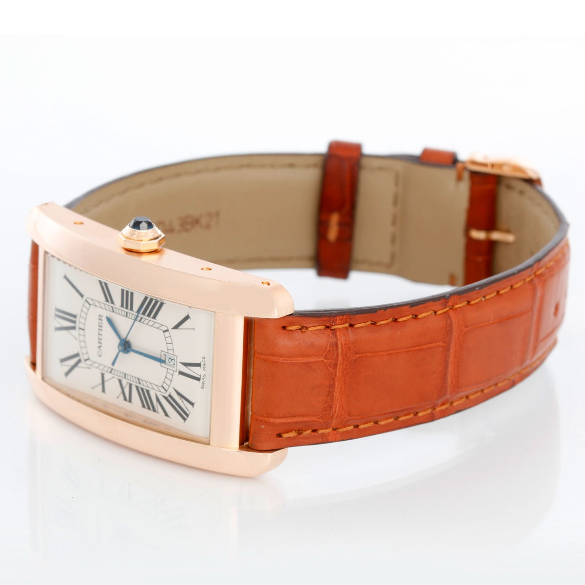 Cartier Tank Americaine 18k Rose Gold Automatic Watch W2609156 - Automatic winding. 18k rose gold case (26 x 45mm). Silvered guilloche dial. Cartier Alligator strap with 18k rose gold Cartier buckle. Pre-owned with Cartier box. Will fit 7 3/4' wrist