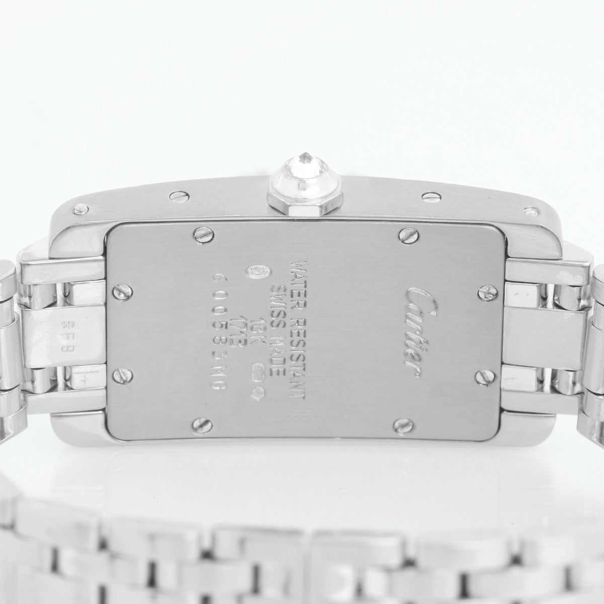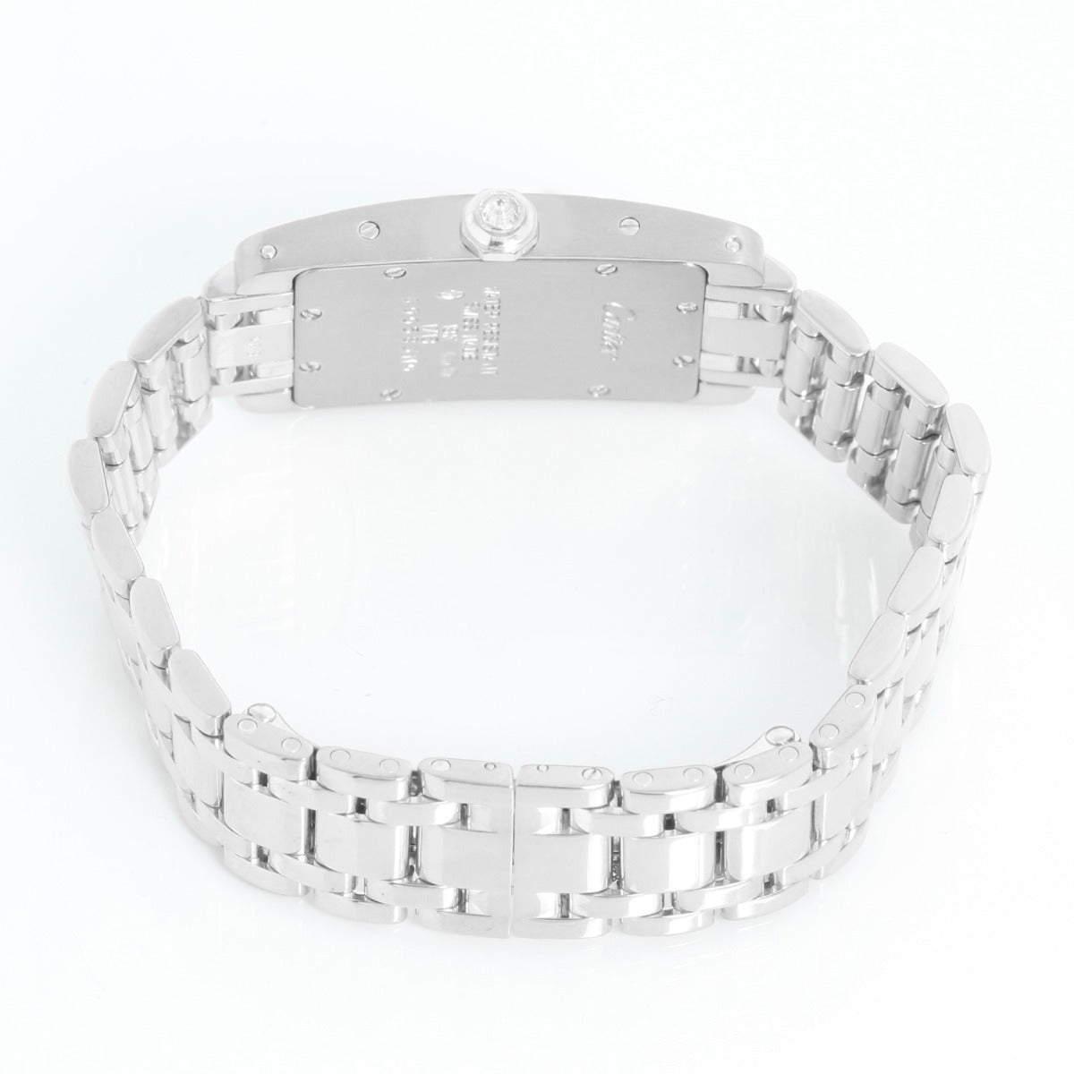 Cartier Tank Americaine Ladies White Gold W26019L1 1713 - Quartz movement. 18k white gold case with 2-row factory diamond bezel (19 mm x 35 mm ). Guilloche silver colored with black Roman numerals. 18k white gold Cartier bracelet with deployant clasp; will fit a 6 1/4 inch wrist . Pre-owned with Cartier box.