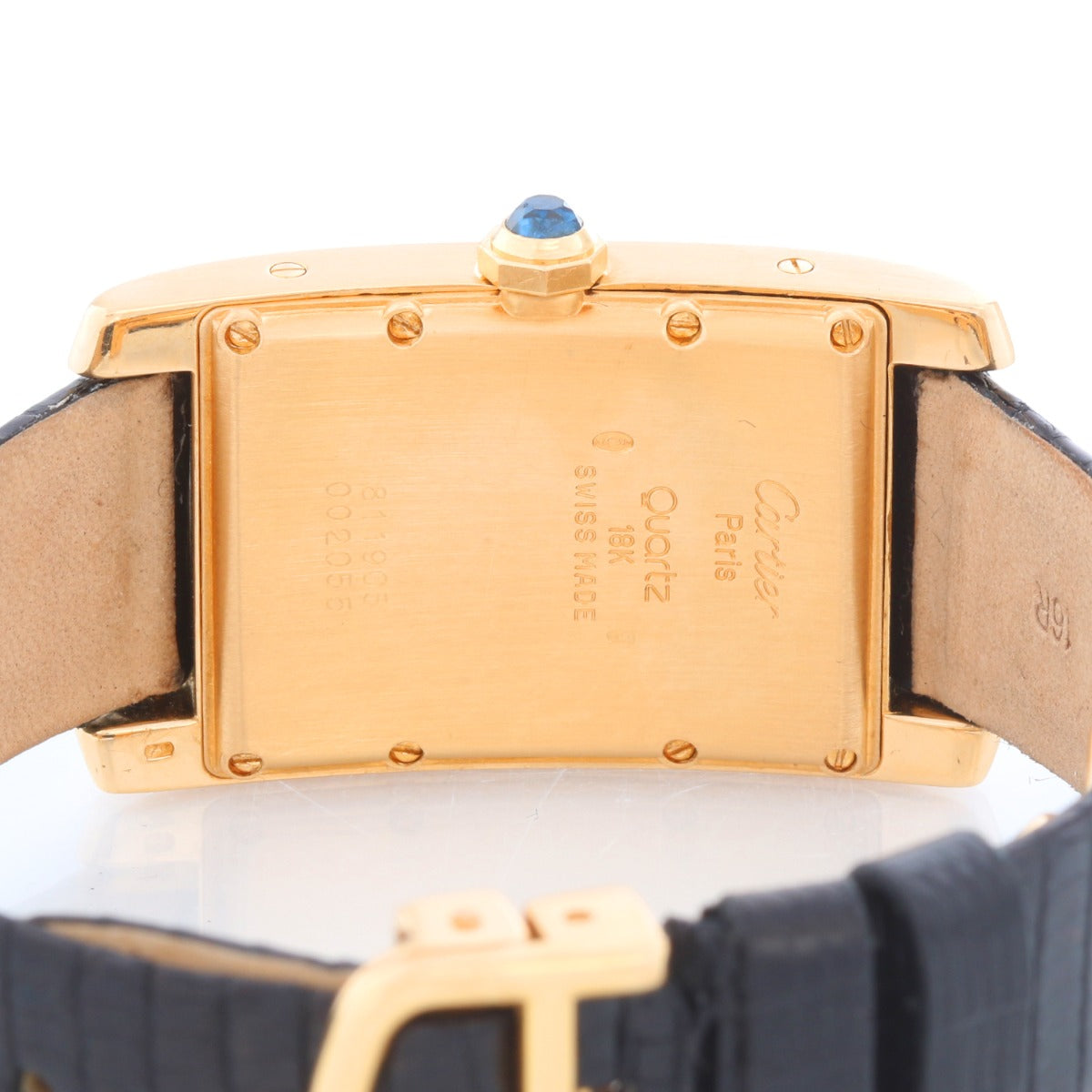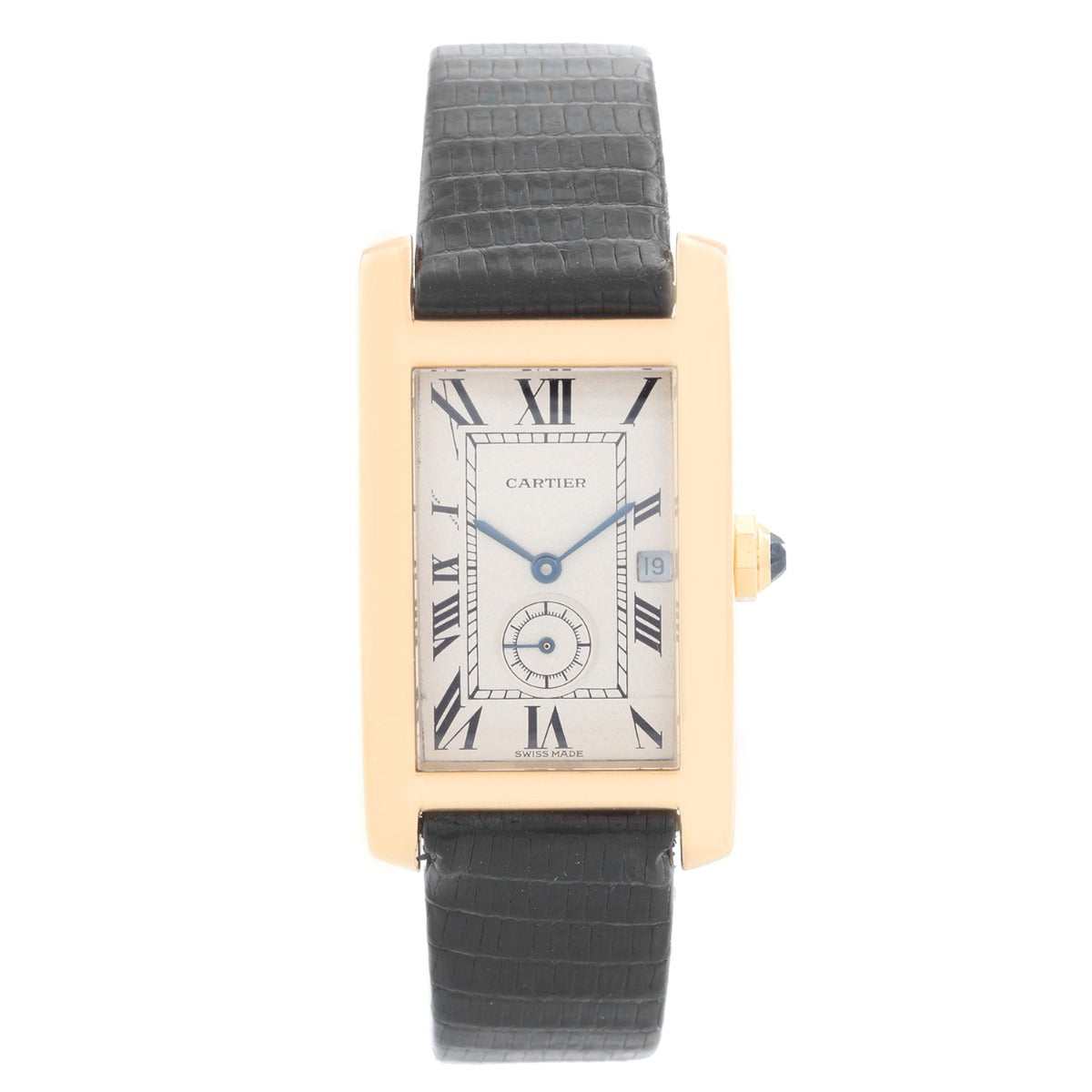 Cartier Tank Americaine (American) 18k Gold Midsize Men's/Ladies Watch 811905 - Quartz. 18k yellow gold case (23mm x 41mm). Ivory colored dial with black Roman numerals; date at 6 o'clock. Black lizard strap band with 18k yellow gold Cartier deployant buckle. Pre-owned with custom box.