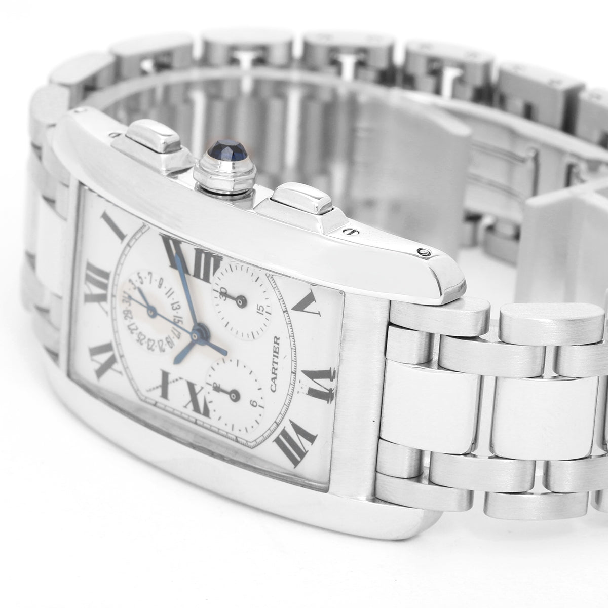 Cartier Tank Americaine Chronograph Men's/Ladies 18k White Gold Watch W260334 - Quartz chronograph with date. 18k white gold rectangular style case (26mm x 45mm). Silver guilloche dial with black Roman numerals; date; hour minutes and seconds recorders. 18K white gold Cartier bracelet. Pre-owned with Cartier Box and books.