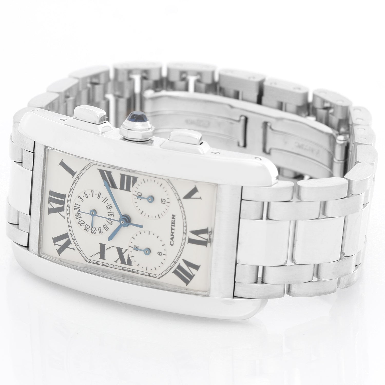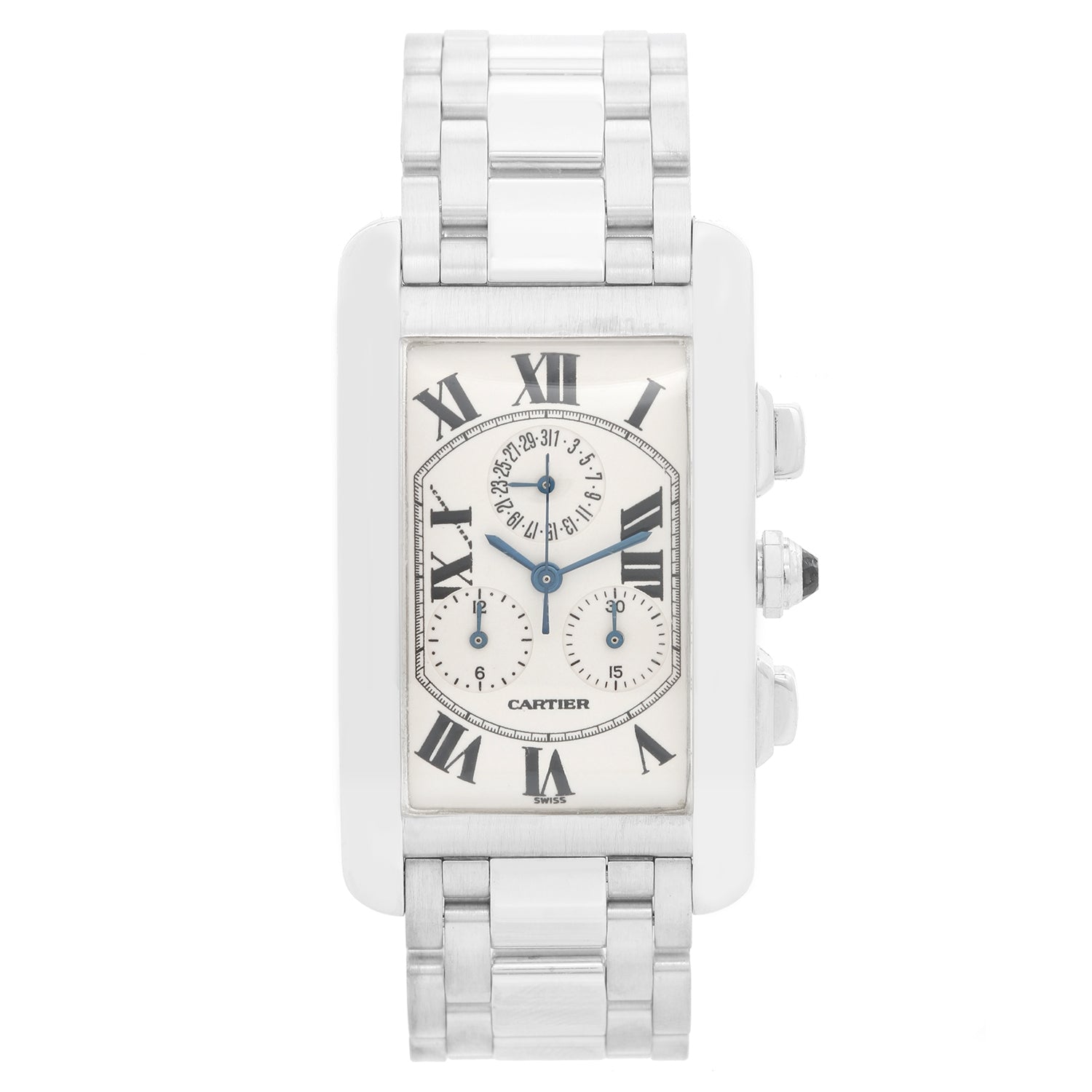 Cartier Tank Americaine (or American) Chronograph Men's Watch W2603356 - Quartz chronograph with date. 18k white gold rectangular style case (26mm x 45mm). Ivory colored dial with black Roman numerals; date; hour minutes and seconds recorders. White gold bracelet; Fits a 7 inch wrist. Pre-owned with box.