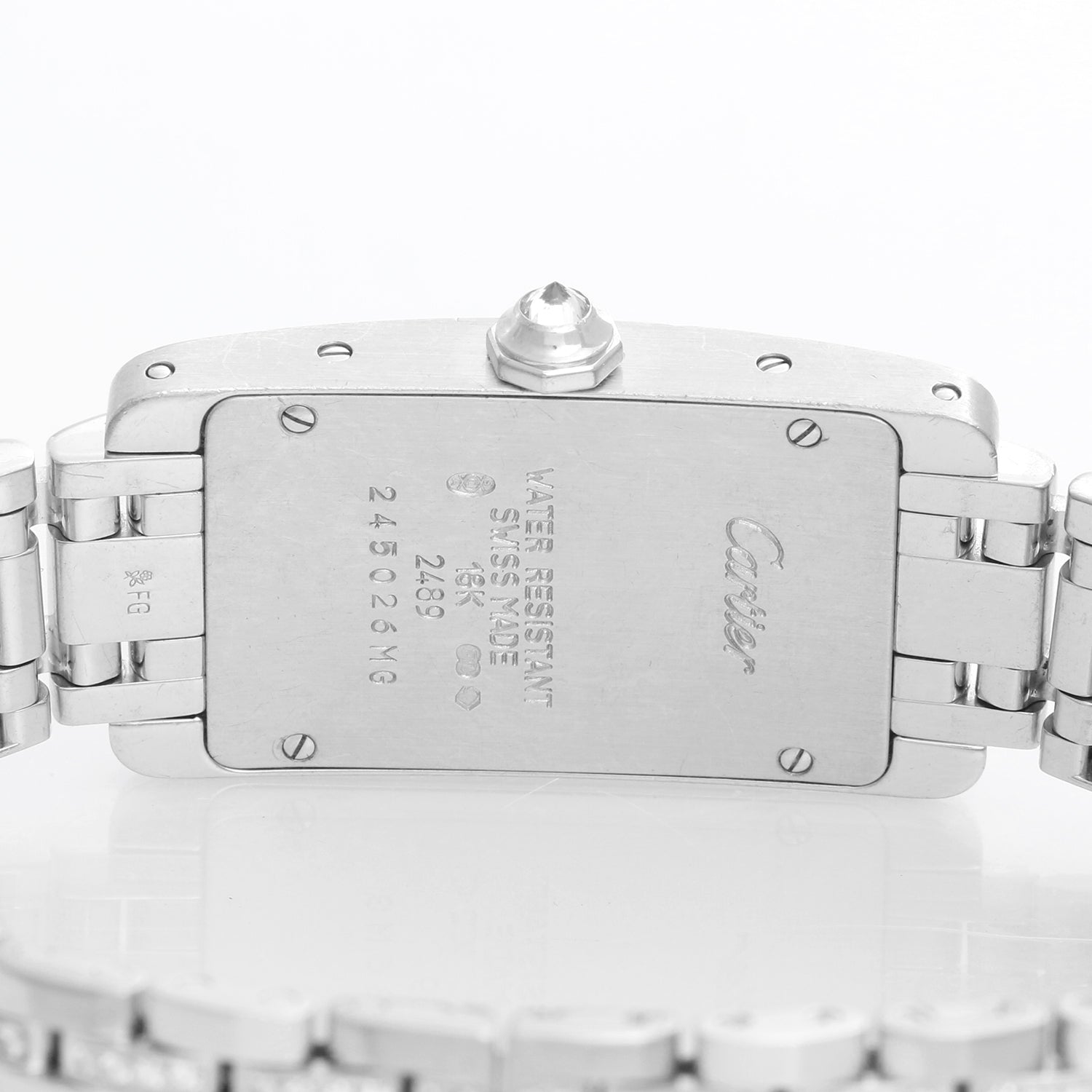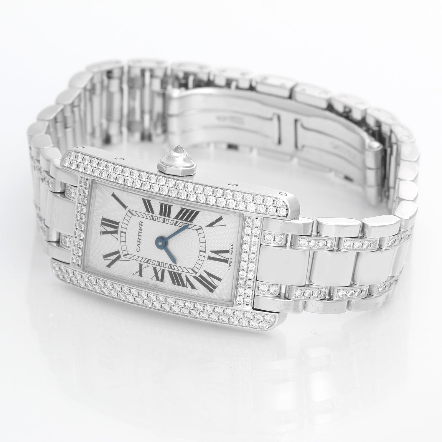 Cartier Tank Americaine (or American) Ladies White Gold Diamond Watch WB7018L1 - Quartz movement. 18k white gold case with 2-row factory diamond bezel (19 mm x 35 mm ). Silver guilloche with black Roman numerals. 18k white gold Cartier bracelet with deployant clasp. Pre-owned with Cartier box and books. Diamond weight .98 cts.