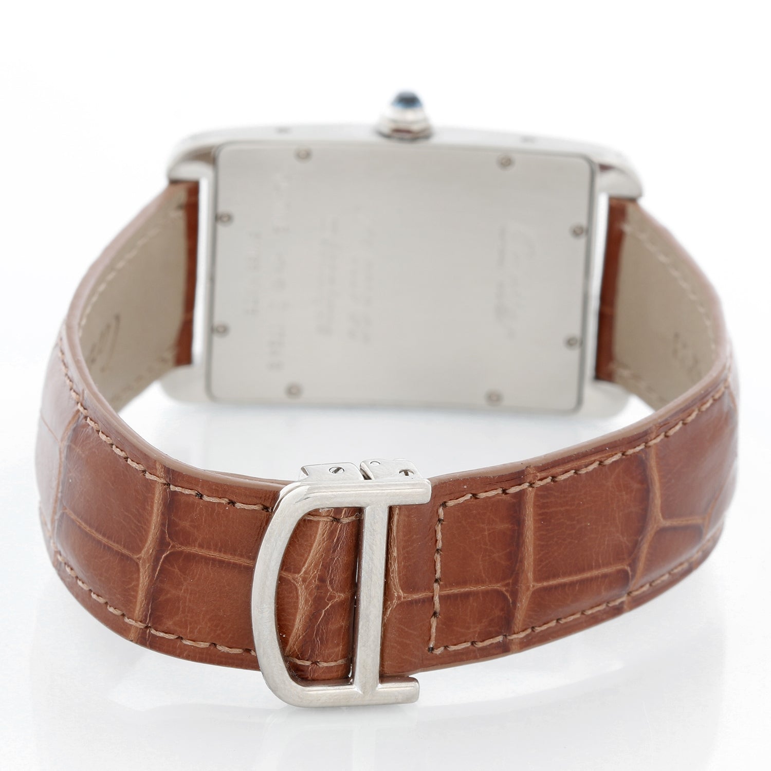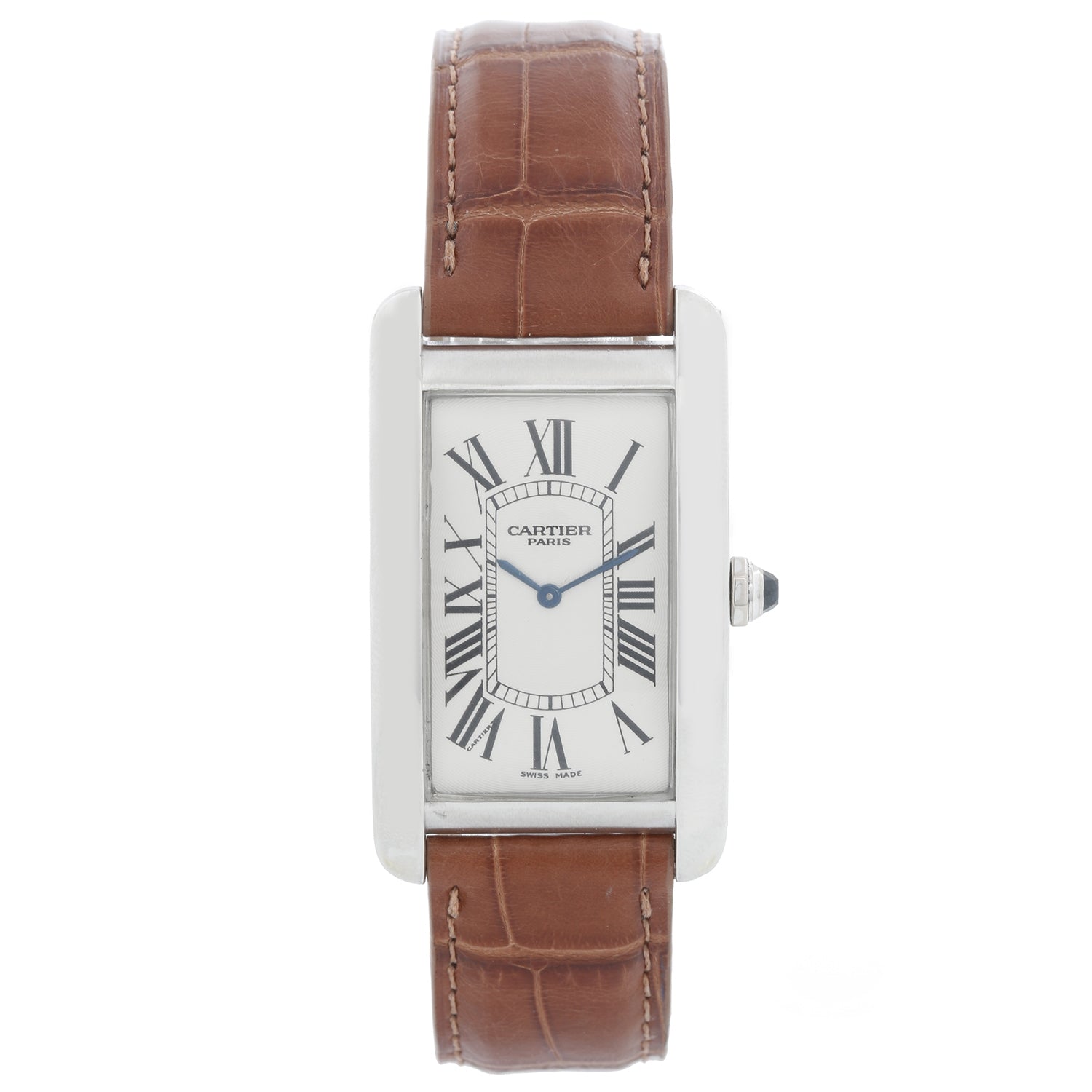 Cartier Tank Americaine (or American) Large Men's Platinum Watch Ref 1734 - Manual winding. Platinum rectangular style case (44 mm x 27 mm). Silver dial with black Roman numerals. Strap band with 18k white gold Cartier deployant buckle. Pre-owned with Cartier box.