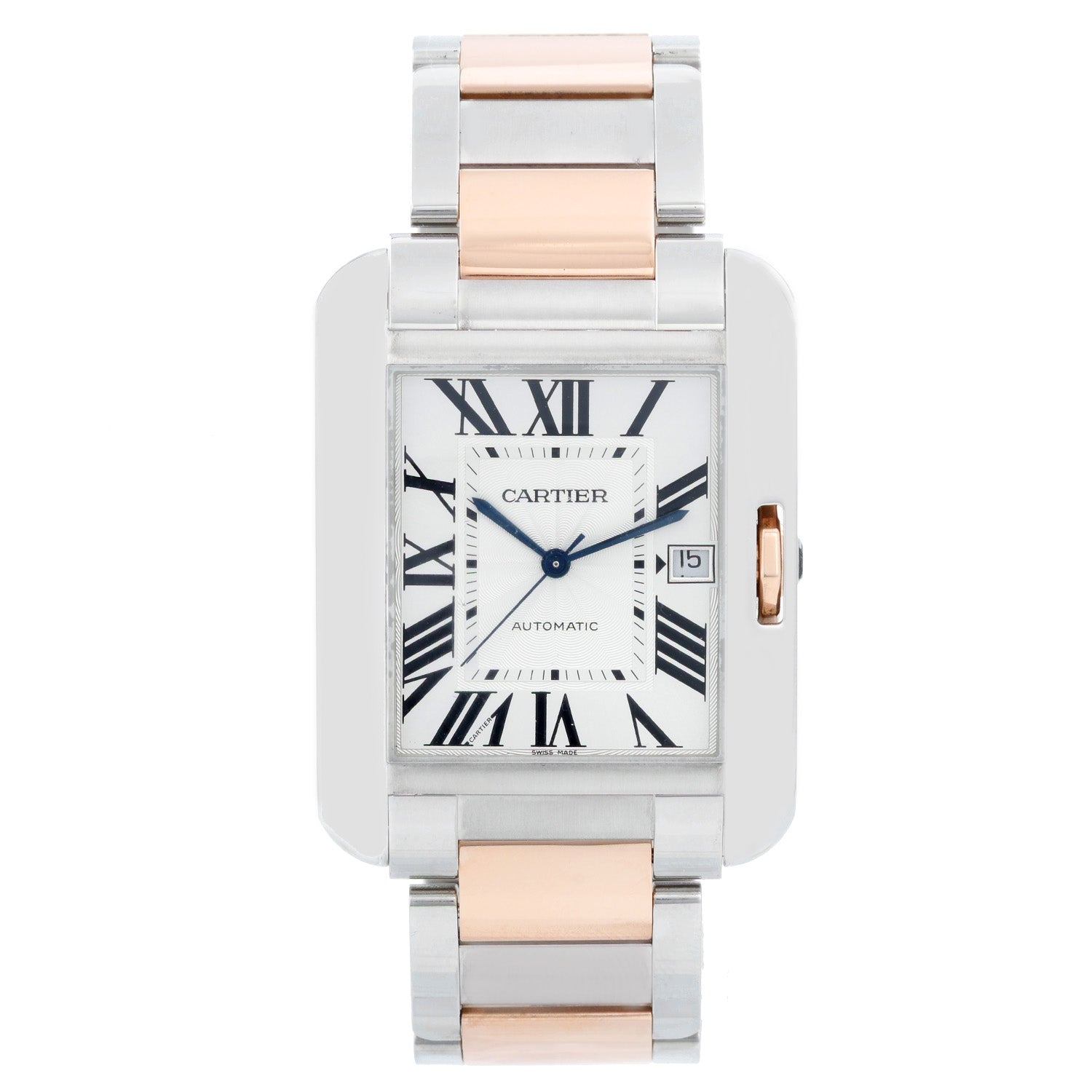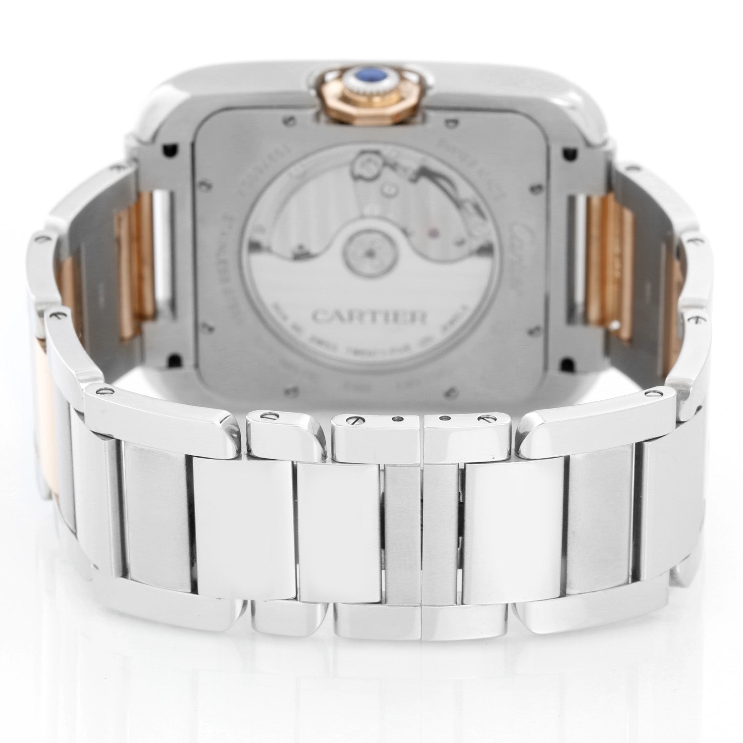 Cartier Tank Anglaise Stainless Steel and Rose Gold Mens Watch W5310006 - Automatic winding . Stainless steel case ( 36 x 47mm ) Open case back . Silvered dial with lacquered flinque dial. 18K Rose gold and stainless steel bracelet . Pre-owned with Cartier box and papers .
