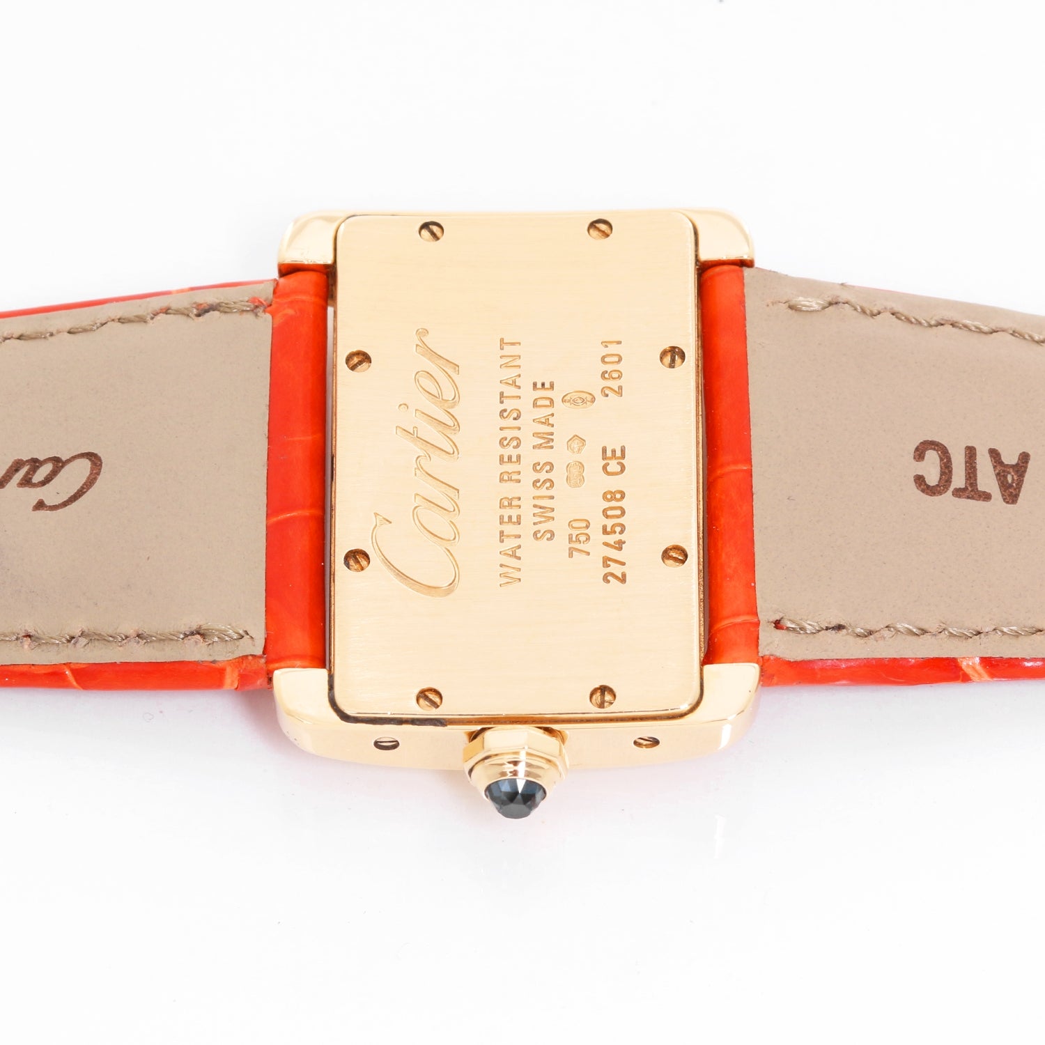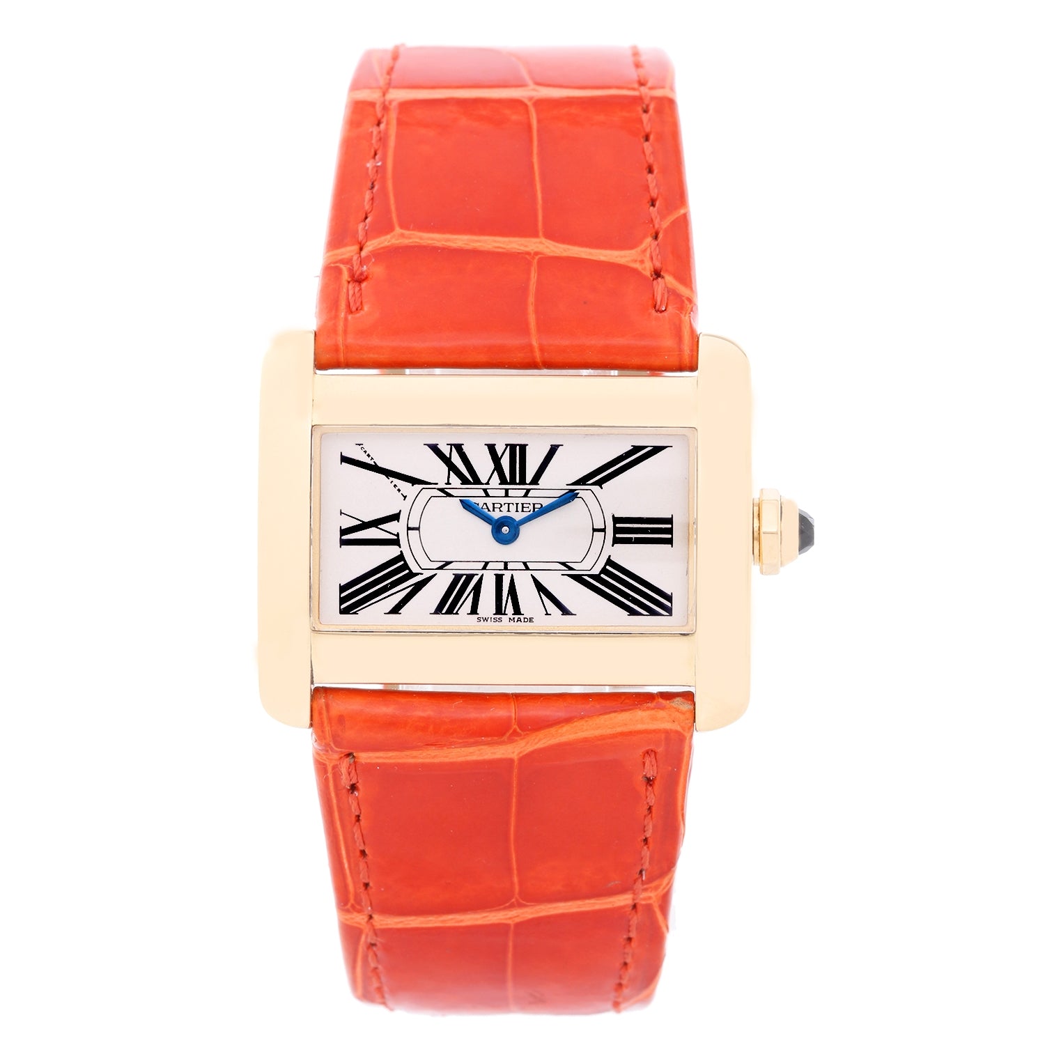 Cartier Tank Divan 18K Yellow Gold Watch W6300356 - Quartz. Rectangle 18K Yellow Gold ( 25 mm x 31 mm). White dial with Roman Numerals. Orange Cartier leather strap. Pre-owned with box.
