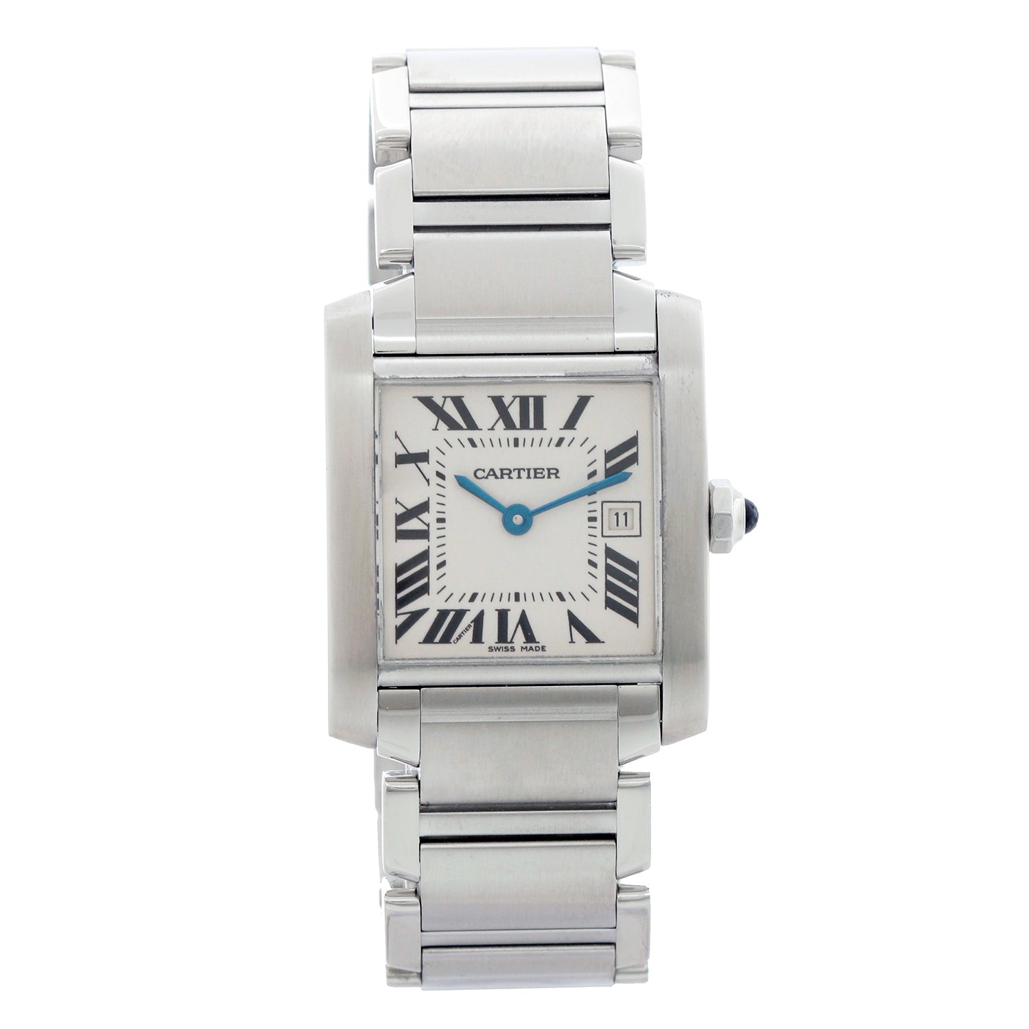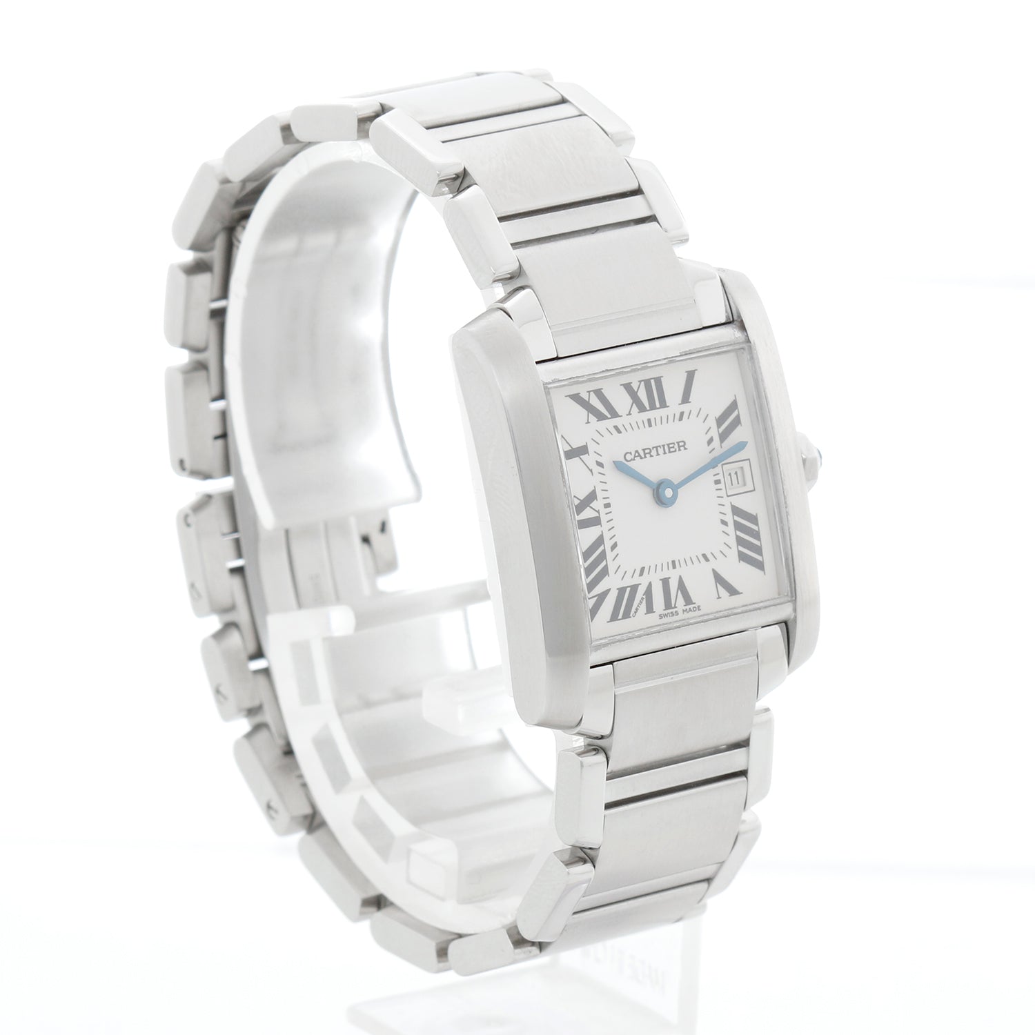 Cartier Tank Francaise Midsize Stainless Steel Watch W51011Q3 2465 - Quartz. Midsize Tank Francaise. Stainless steel case (25mm x 30mm). Ivory colored dial with black Roman numerals; date at 3 o'clock. Stainless steel bracelet with deployant clasp. Pre-owned custom box.