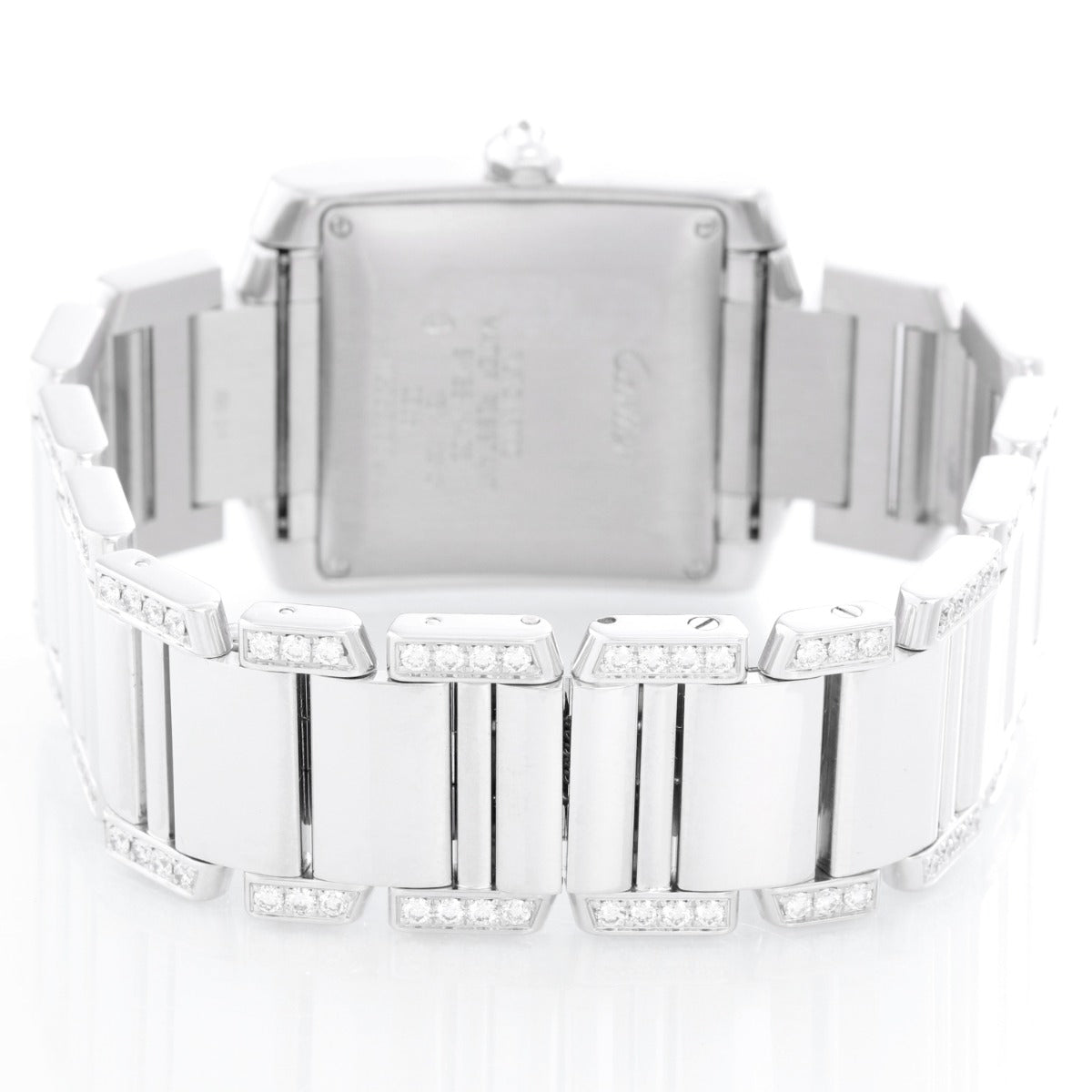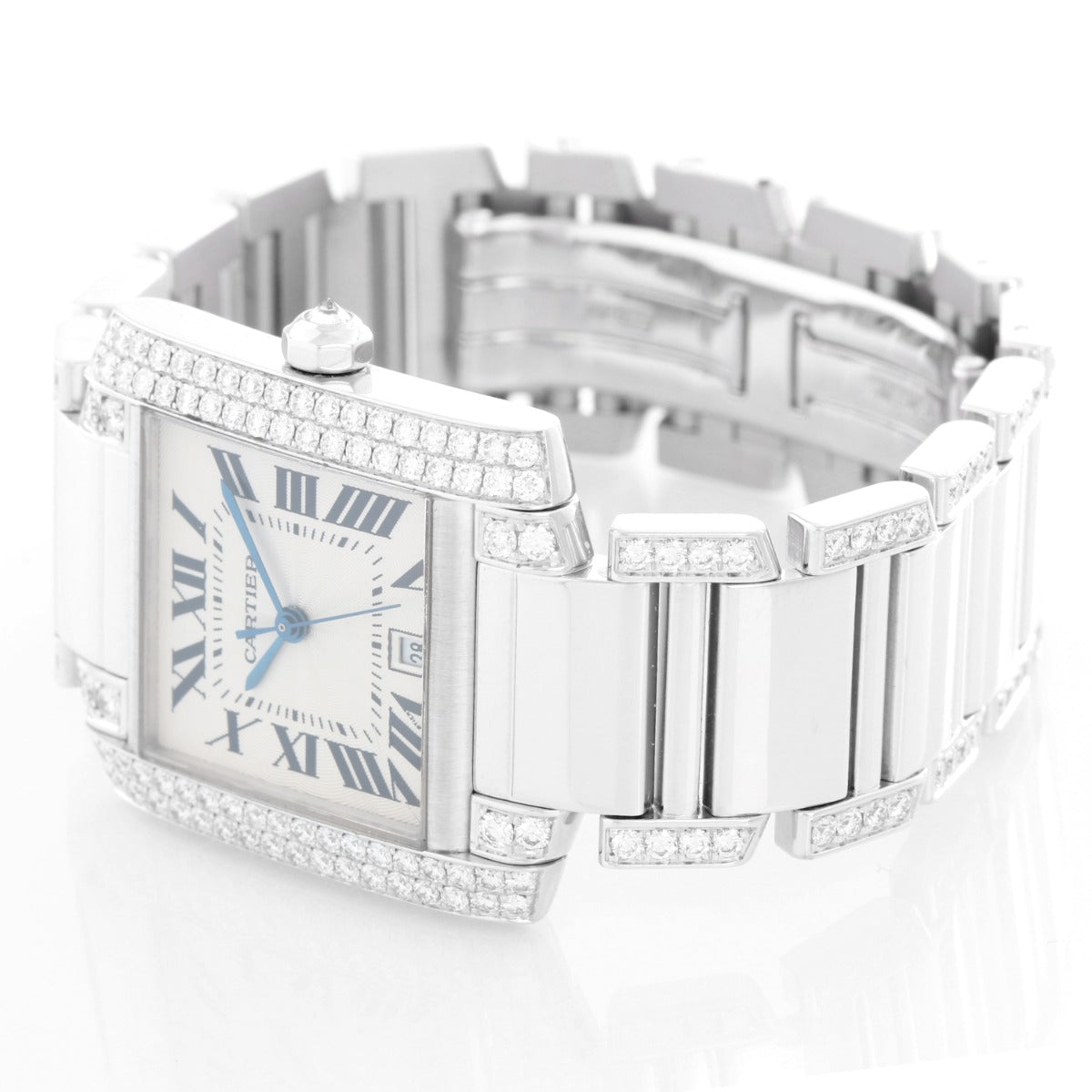 Cartier Tank Francaise, WE1003SF - Men's or ladies automatic winding wristwatch. 18k white gold with 2-row factory diamond bezel (28mm x 32mm). Silver dial with black Roman numerals and date at 6 o'clock. 18k white gold Cartier bracelet with deployant clasp. Pre-owned with box and book.
