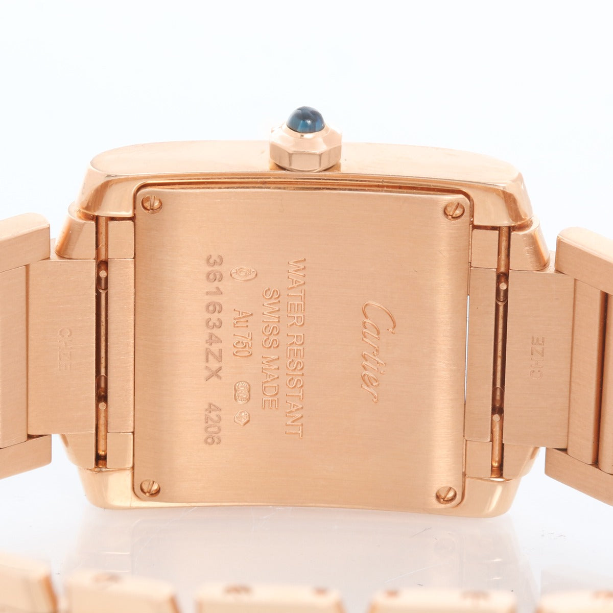 Cartier Tank Francaise Midsize 18k Rose Gold Watch WGTA0030 - Quartz. 18k rose gold case; blue sapphire cabochon crown (25mm x 30mm). Ivory colored dial with black Roman numerals; date at 3 o'clock. Cartier 18k rose gold bracelet; will fit a 6 3/4 inch wrist . Pre-owned with Cartier box and papers.