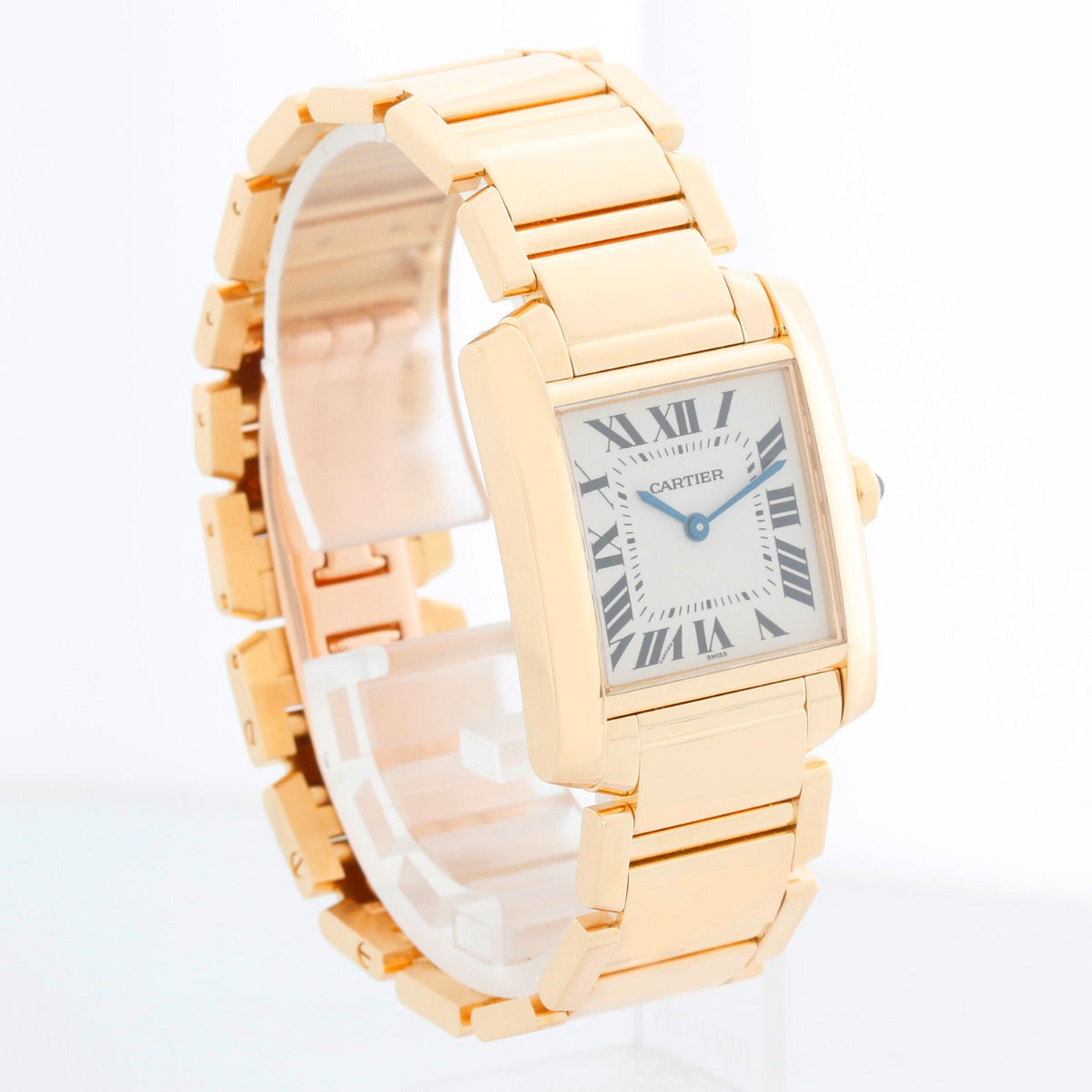 Cartier Tank Francaise Midsize 18k Yellow Gold Watch W50003N2 1821 - Quartz. 18k yellow gold case; blue sapphire cabochon crown (25mm x 30mm). Ivory colored dial with black Roman numerals. 18k gold Cartier bracelet; will fit a 6 1/2 inch wrist. More links available for purchase . Pre-owned with Cartier box and papers. Circa 2000.