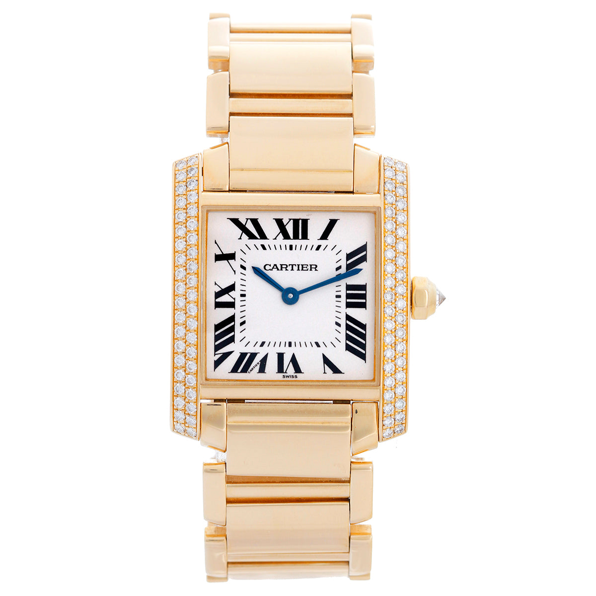 Cartier Tank Francaise Midsize 18k Yellow Gold Watch - Quartz. 18k yellow gold case with 2 rows of diamonds (25mm x 30mm). Ivory colored dial with black Roman numerals. 18k yellow gold Cartier Tank Francaise bracelet. Pre-owned with Cartier box and books.