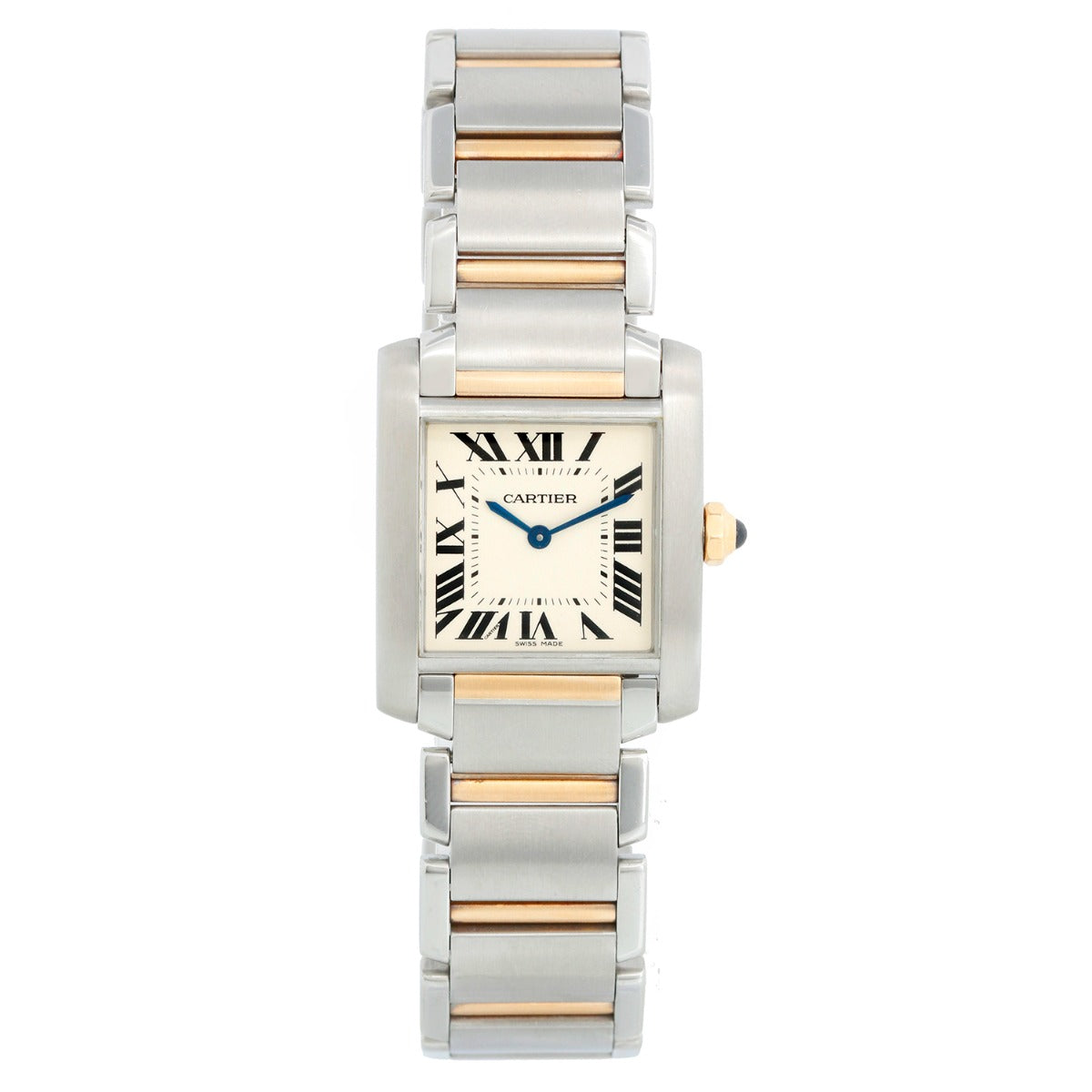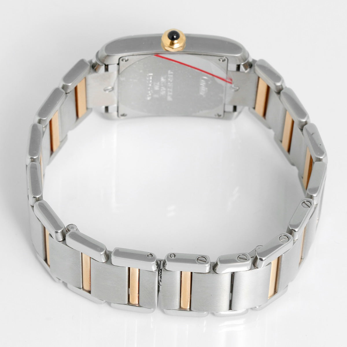 Cartier Tank Francaise Midsize Men's or Ladies 2-Tone Steel & Gold Watch W51006Q4 - Quartz. Stainless steel case with 18K Yellow gold (25mm x 22mm). Ivory colored dial with black Roman numerals. Stainless steel and yellow gold Cartier bracelet with deployant clasp. Pre-owned with Cartier box and papers