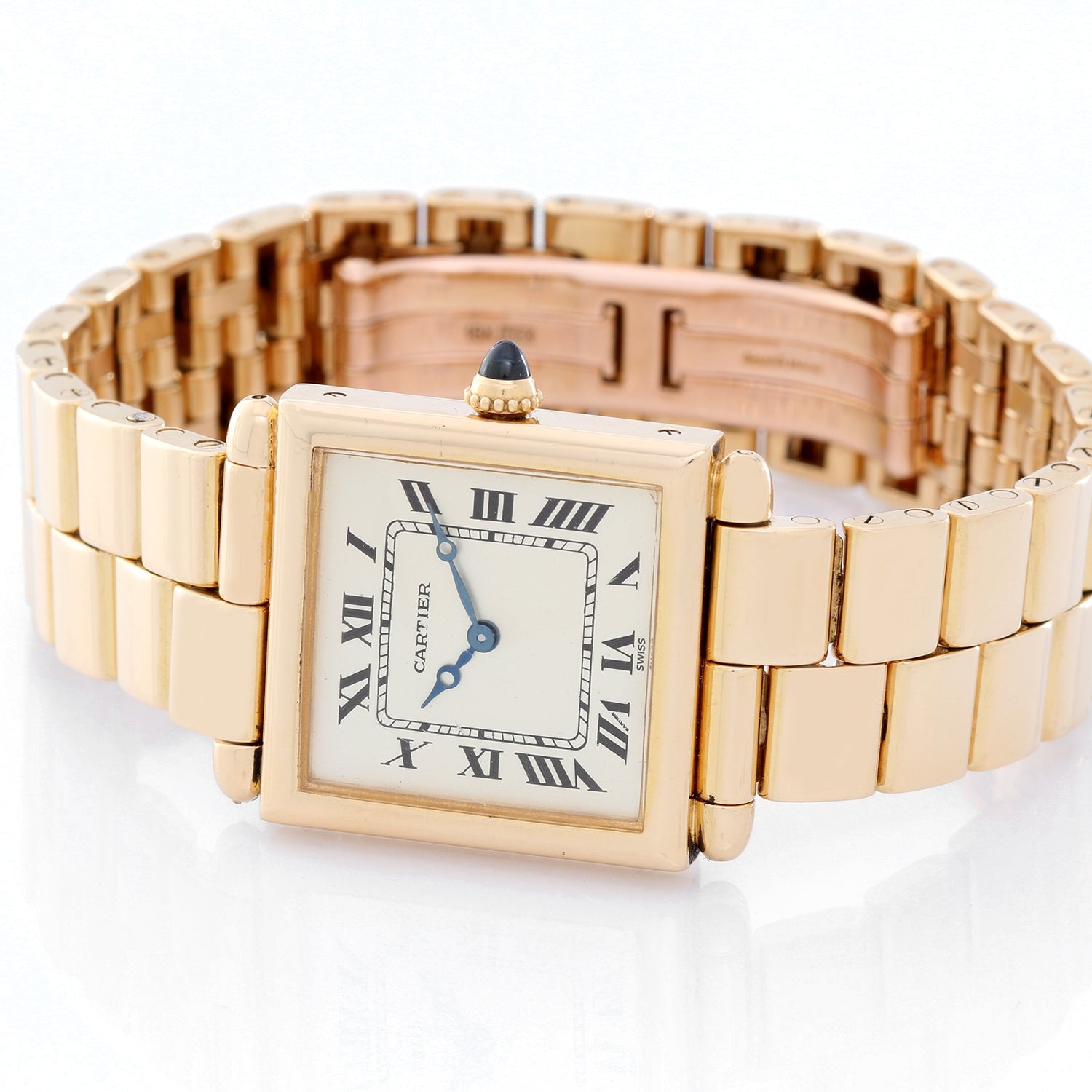 Cartier Tank Obus Men's or Ladies 18k Yellow Gold Watch - Quartz. 18k Yellow gold case (25mm x 32mm). Silver dial with black Roman numerals. 18K Yellow gold bracelet with double deployant clasp. Pre-owned with custom box .