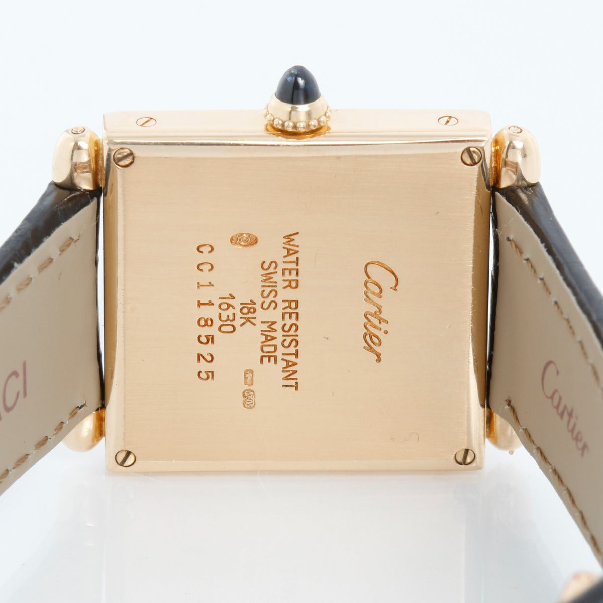 Cartier Tank Obus Men's or Ladies 18k Yellow Gold Watch - Quartz. 18k Yellow gold case (25mm x 32mm). Ivory dial with black Roman numerals. Black Cartier bracelet with 18K yellow gold Cartier deployant clasp. Pre-owned with custom box.