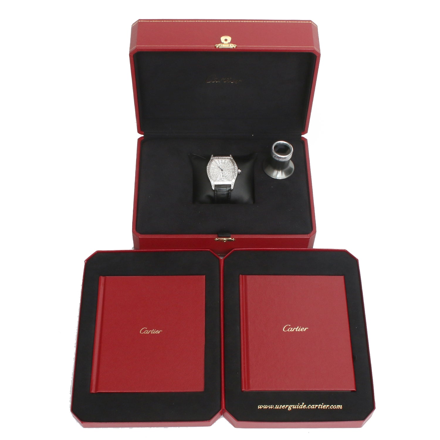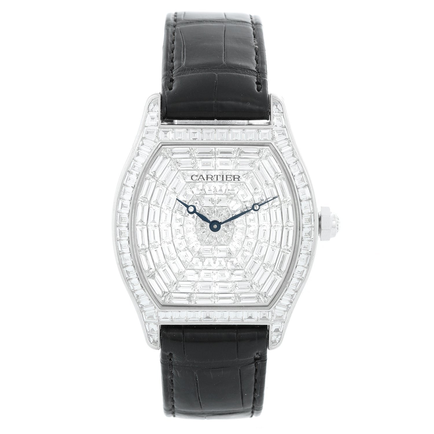 Cartier Tortue XL White Gold Diamond Dial Ladies Watch HP100502 - Manual winding . 18K White gold case with diamond bezel and lugs ( 48 mm x 38 mm ) . Diamond dial with blue Breguet hands; the bezel and dial containing 164 baguette cut diamonds. Black alligator strap with White Gold Cartier deployant clasp . Pre-owned with Cartier box and papers. Papers dated 2018 .