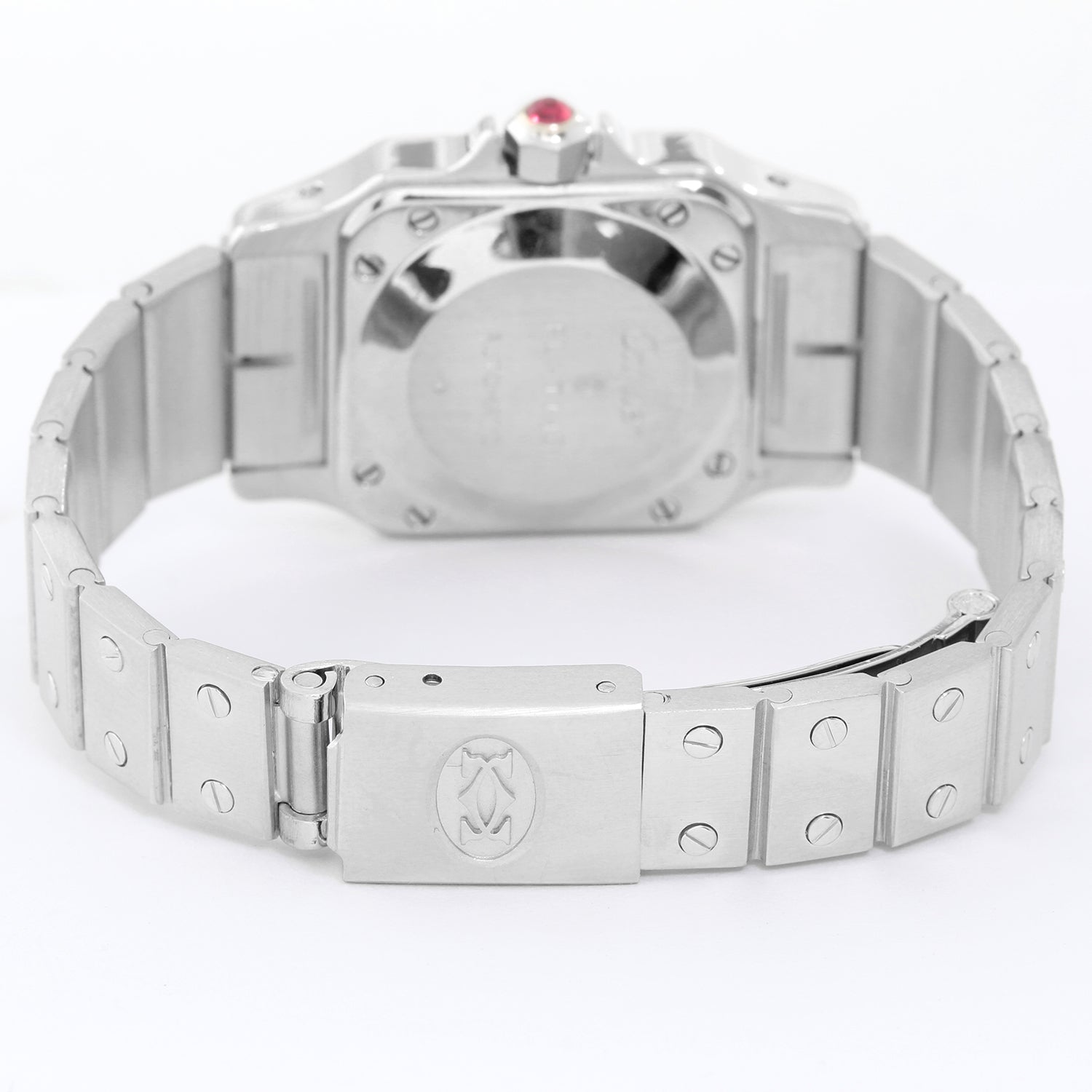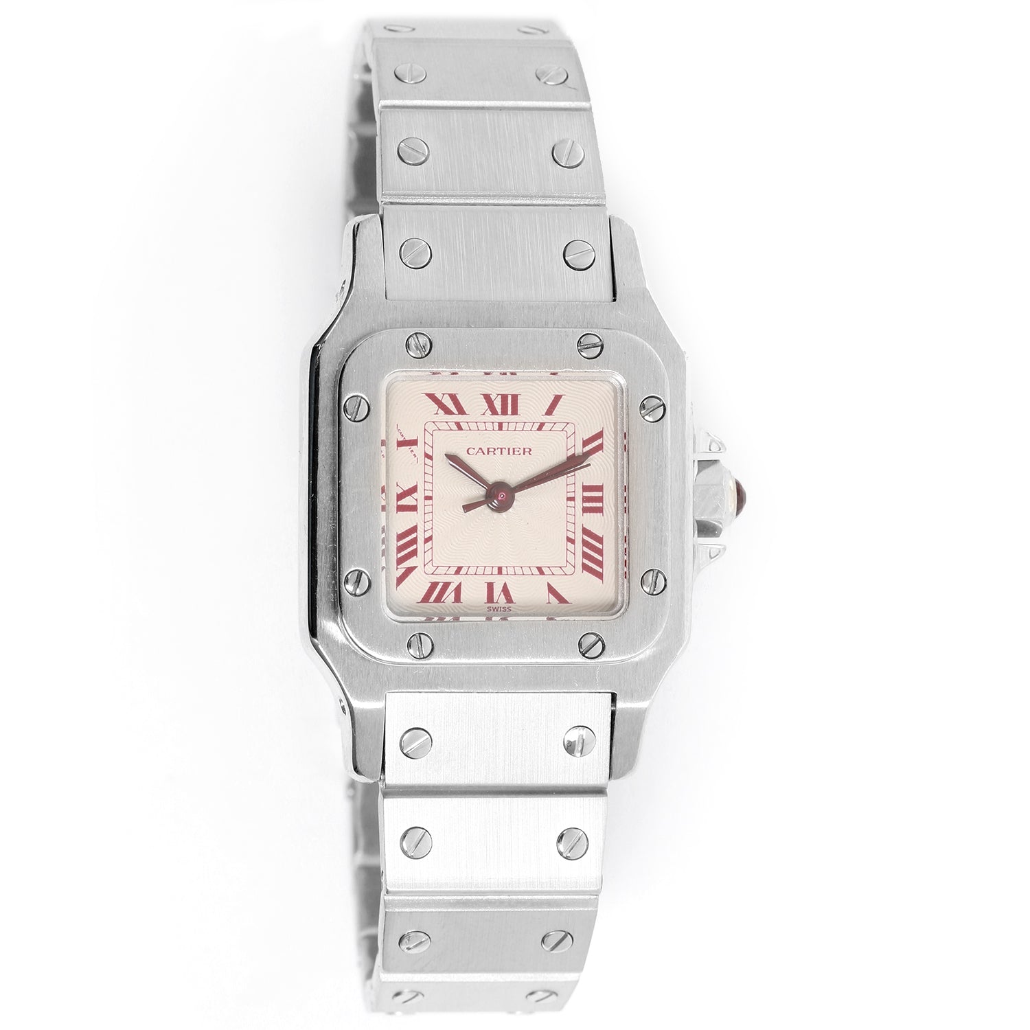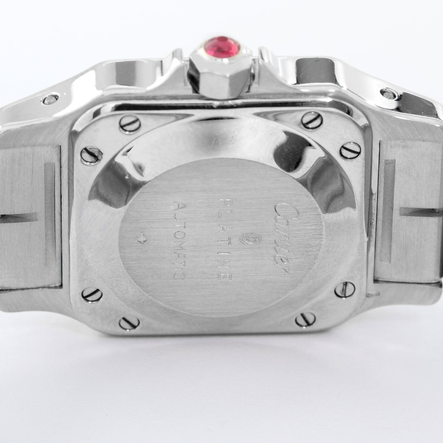 Extremely Rare Cartier Platinum Santos Ladies Watch - Automatic. Platinum ( 24 mm ). White dial with red roman numerals and red tracking. Platinum bracelet with deployant clasp. Pre-owned with Cartier box and papers. Wrist size 5 1/2 inch
