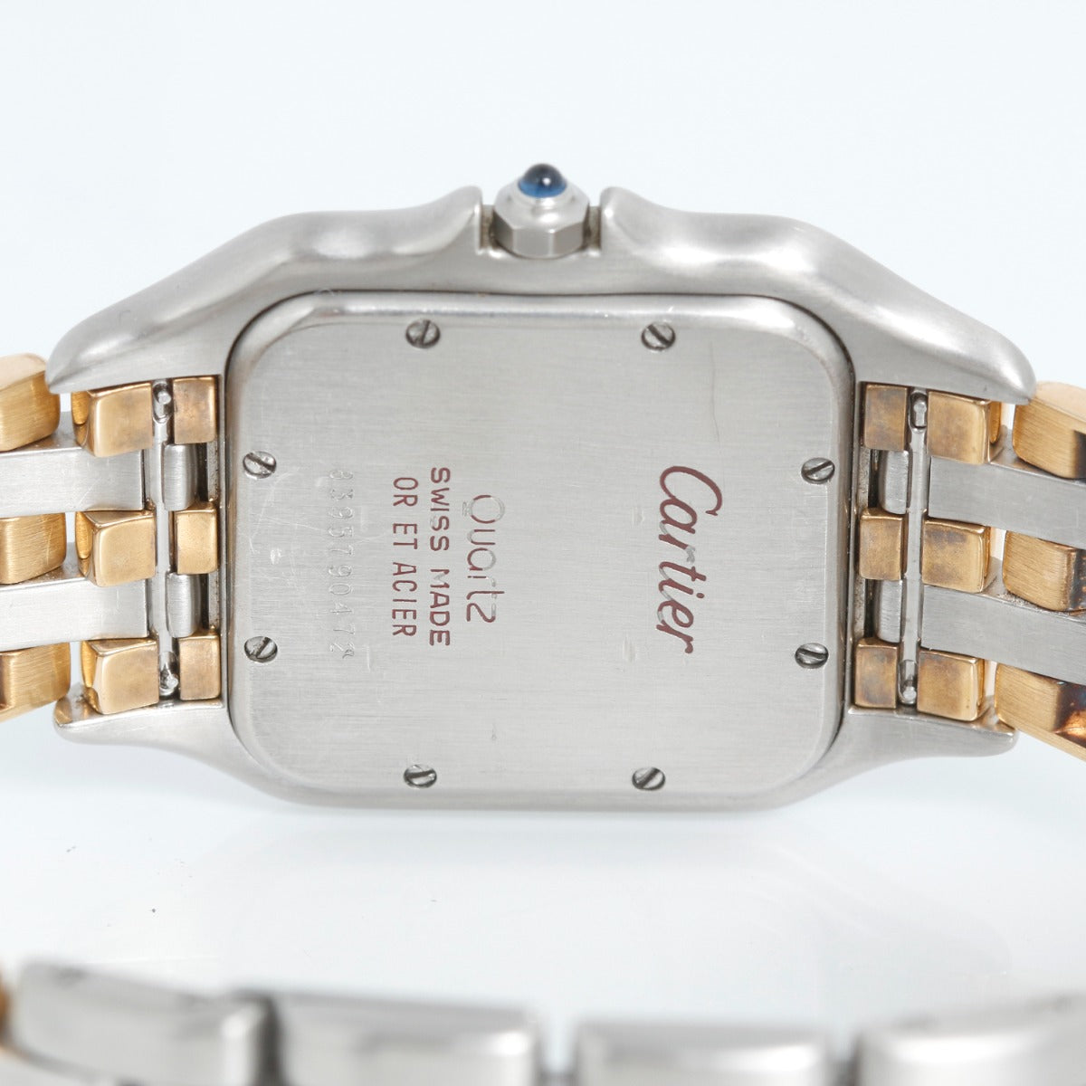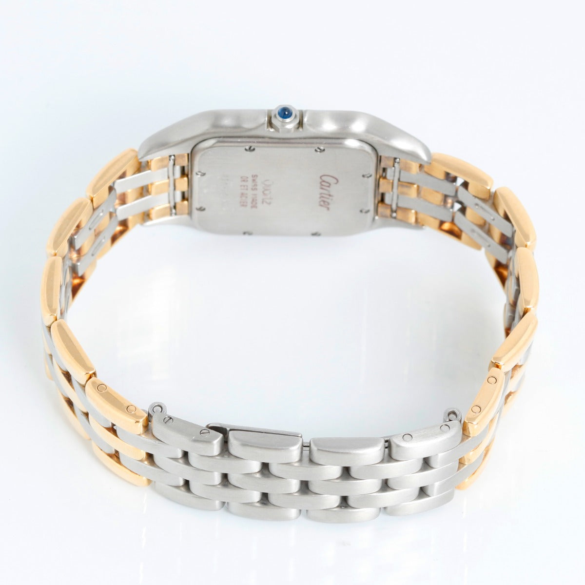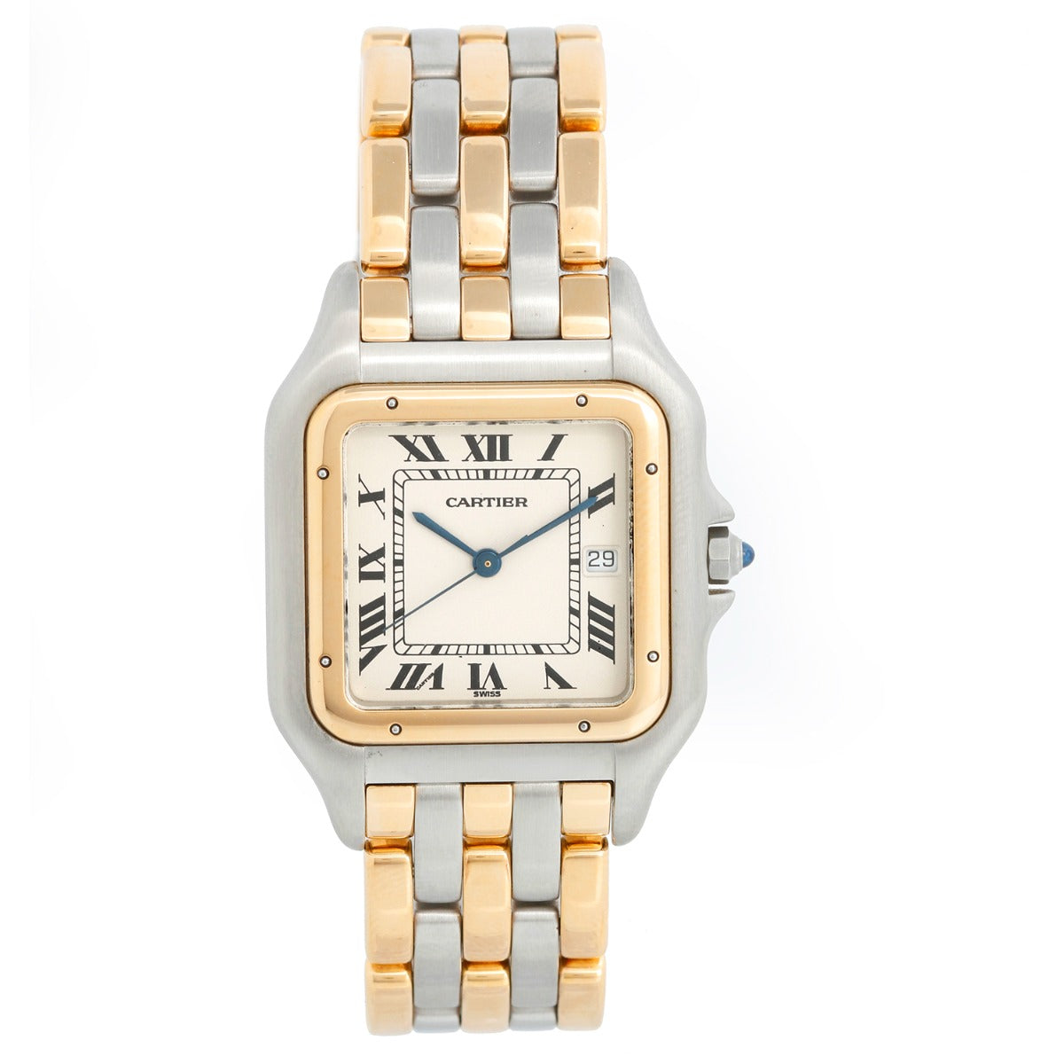 Cartier 3-Row Panther 2-Tone Steel & Gold Jumbo Watch W25027B8 - Quartz. Stainless steel case with 18k yellow gold bezel (29mm x 40mm). Ivory colored dial with black Roman numerals and date at 3 o'clock. Stainless steel and 18k yellow 3-row Cartier Panther bracelet; will fit up to a 7 inch wrist . Pre-owned with Cartier box and papers. Dated late 1980's