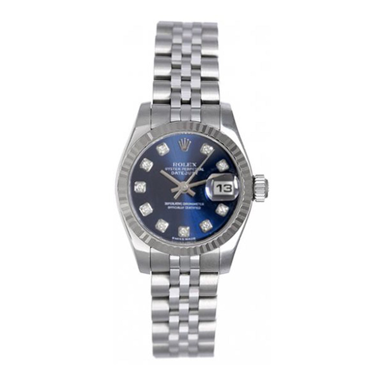 Rolex Ladies Datejust 179174 - Automatic winding wristwatch. Stainless steel case with 18k white gold Fluted bezel (26mm diameter) Genuine Rolex blue diamond dial. Stainless steel hidden-clasp Jubilee bracelet. Pre- owned with Rolex box and books.