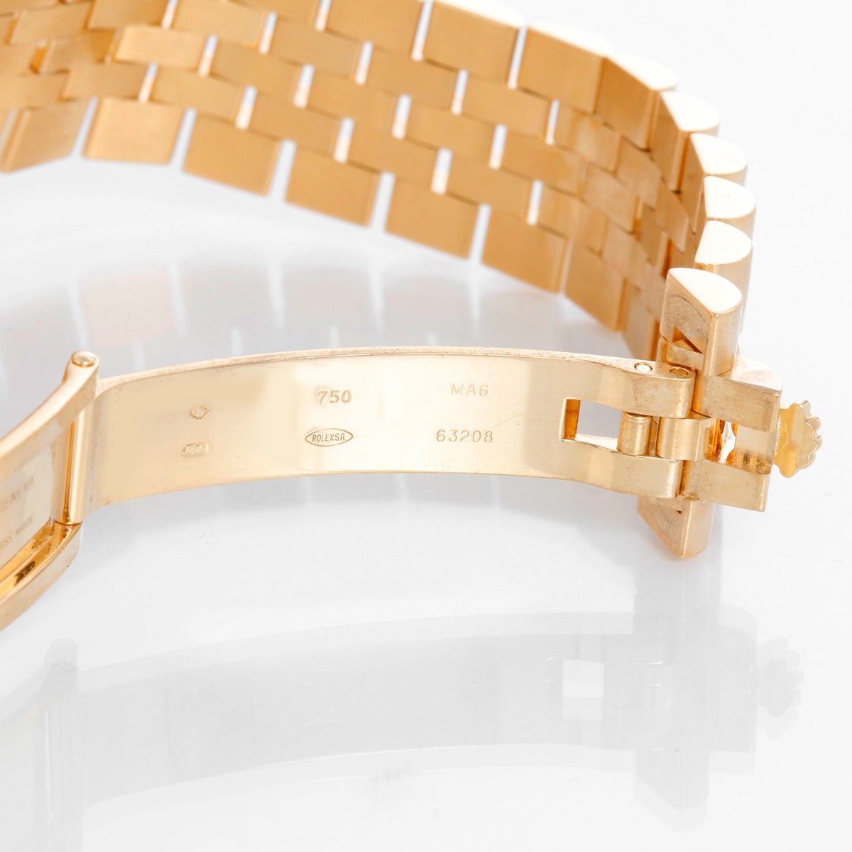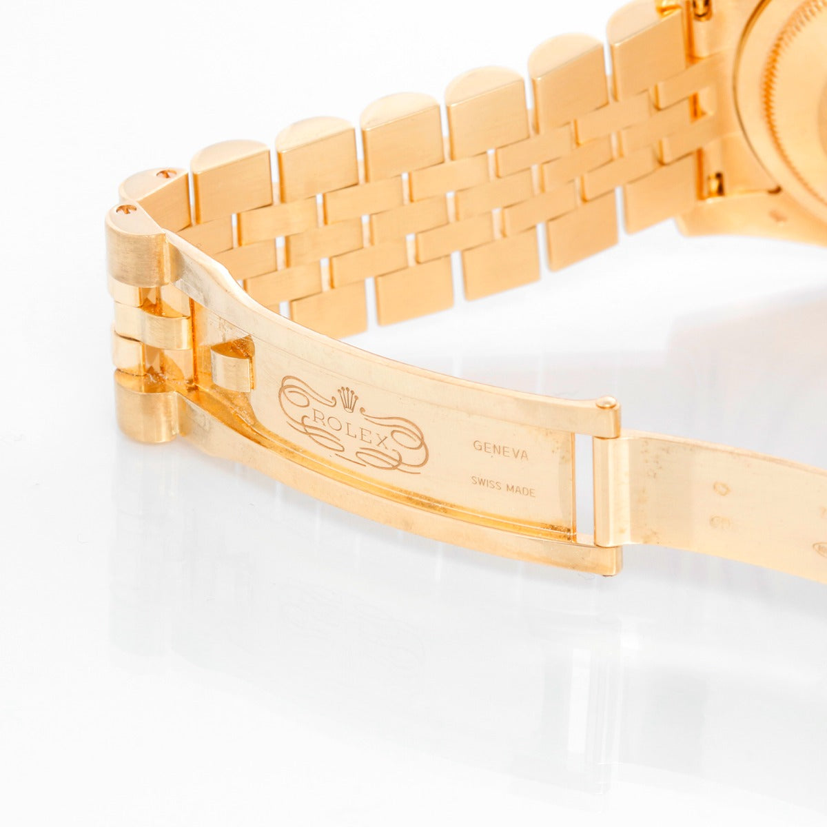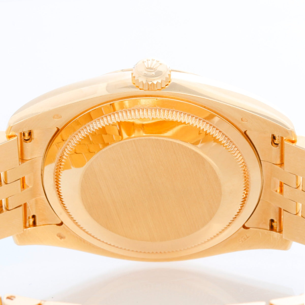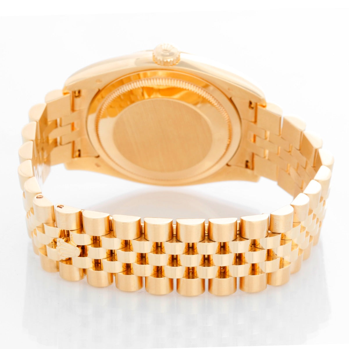 Men's Gold Rolex Datejust Watch 116208 - Automatic winding. 18k yellow gold case and smooth bezel (36mm diameter). Factory Green Pave Diamond 6 & 9 markers . 18k yellow gold Jubilee bracelet. Pre-owned with Rolex box and service papers. Comes with two year Rolex warranty