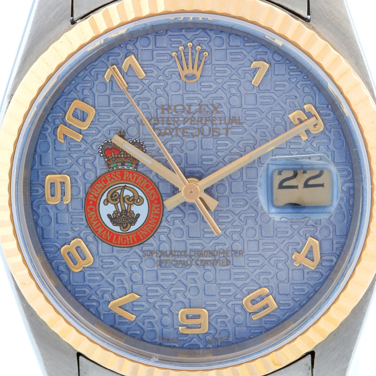 Rolex Datejust 2-Tone Men's Steel & Gold Watch 16233 - Automatic winding, Quickset, sapphire crystal. Stainless steel case with yellow gold bezel (36mm diameter). Blue Jubilee Dial with Princess Patricia Canadian Light Infantry Badge. Stainless steel and 18k yellow gold Jubilee bracelet. Pre-owned with custom box