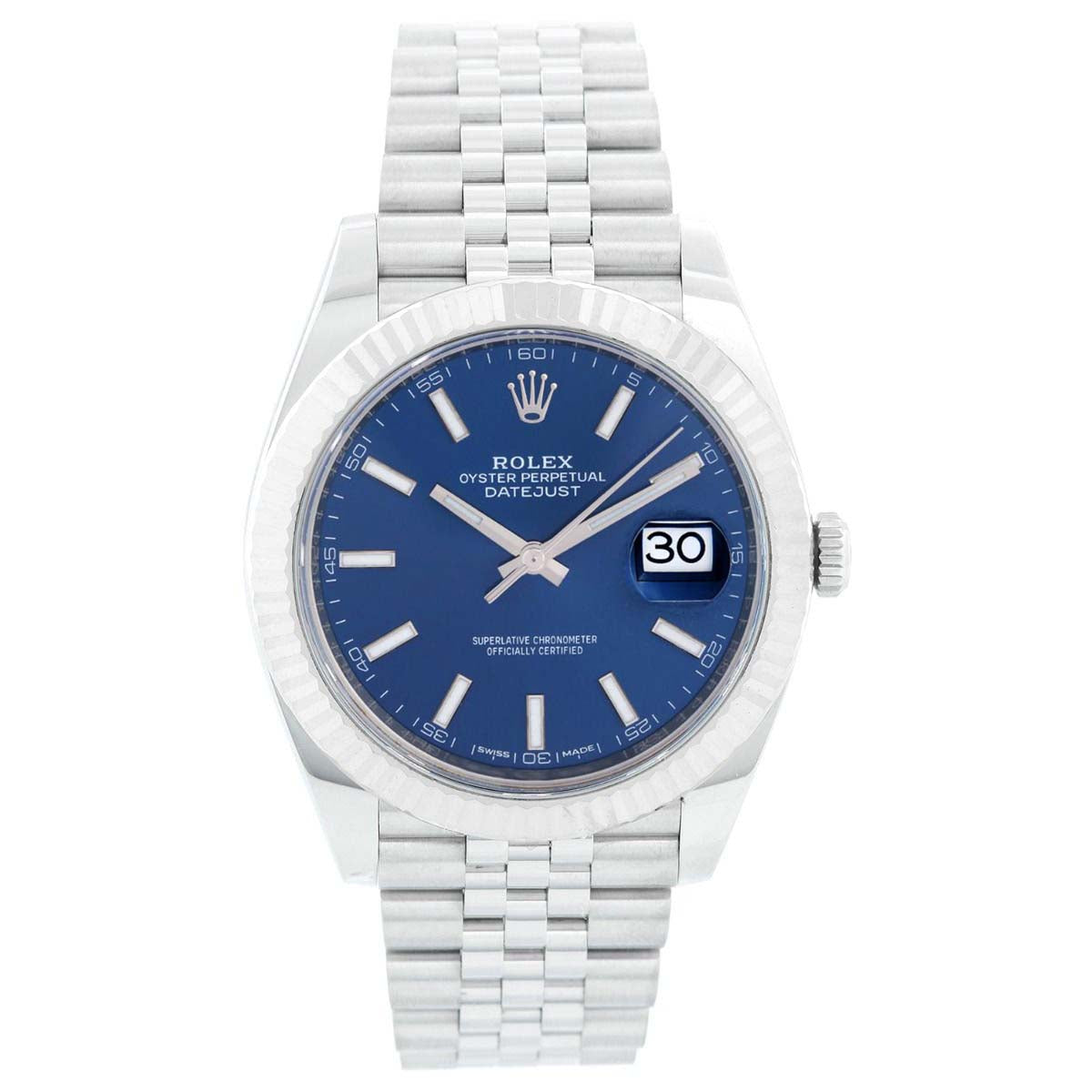 Rolex Datejust 41 Stainless Steel Men's Blue Roman Watch 126334 - Automatic winding, Quickset, sapphire crystal. Stainless steel case with 18k white gold fluted bezel (41mm diameter). Blue stick dial. Stainless steel oyster bracelet. Pre-owned with custom box.