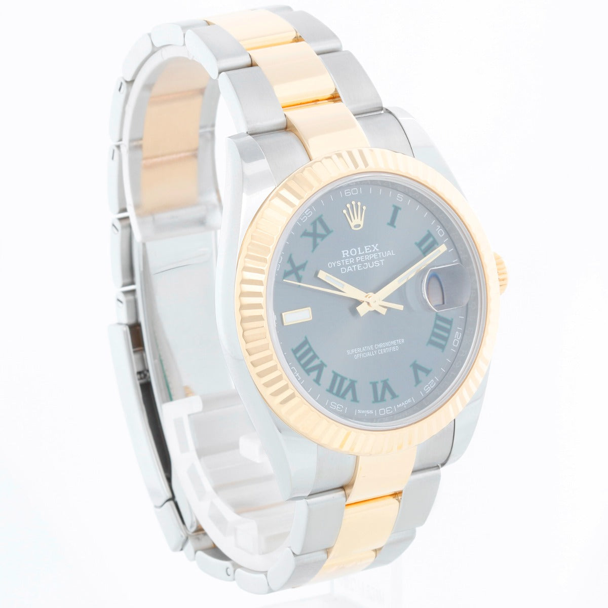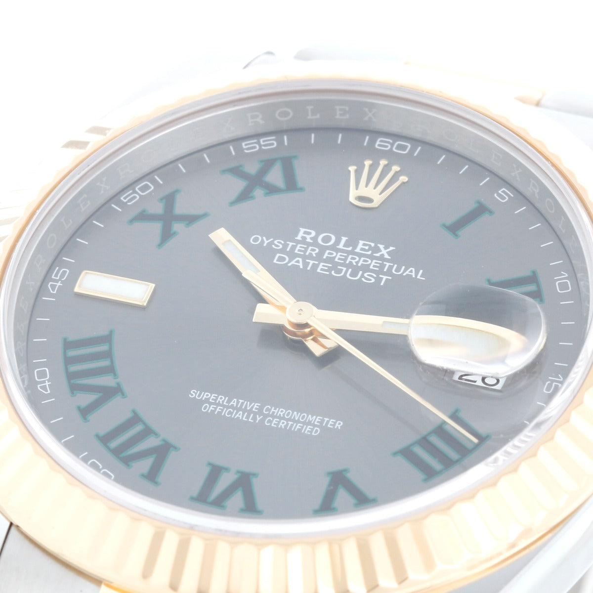 Rolex Datejust II Men's 2-Tone Steel & Gold 41mm Watch 126333 - Automatic winding, Quickset, sapphire crystal. Stainless steel case with 18k yellow gold fluted bezel (41mm diameter). Slate dial with green roman markers. Stainless steel and 18k yellow gold oyster bracelet. Pre-owned with Rolex box