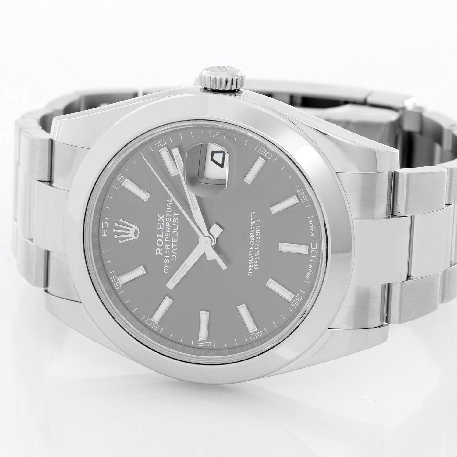 Rolex Datejust II Men's 41mm Stainless Steel 126300 - Automatic winding, sapphire crystal. Stainless steel case with smooth bezel (41mm diameter). Rhodium dial with luminous markers. Stainless steel Oyster bracelet. Pre-owned custom box